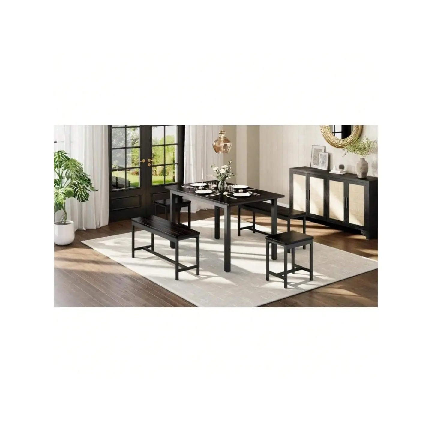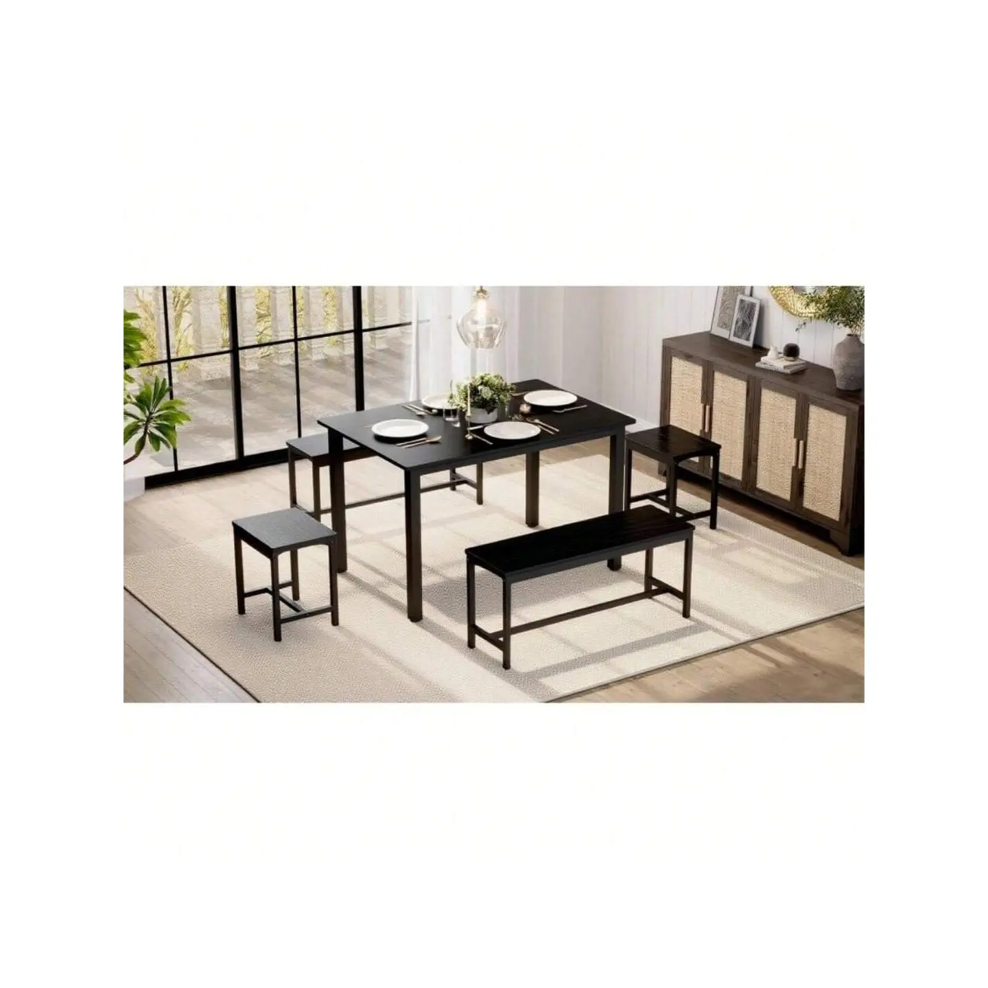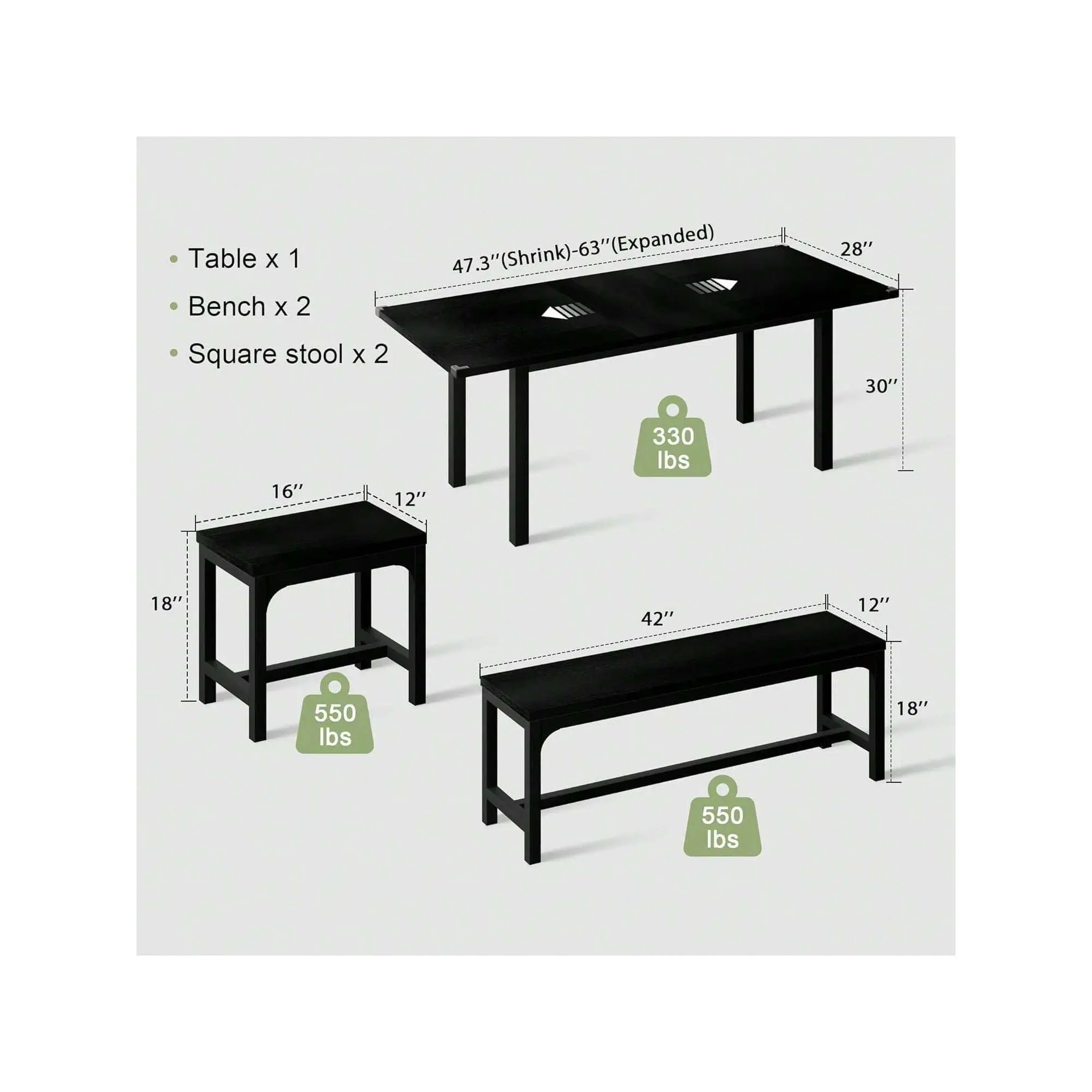 63 Inch 5 Piece Extendable Dining Table Set For 4 To 8 Modern Space Saving Kitchen Table With 2 Benches and 2 Stools Farmhouse Style Dining Room Furniture Set-A