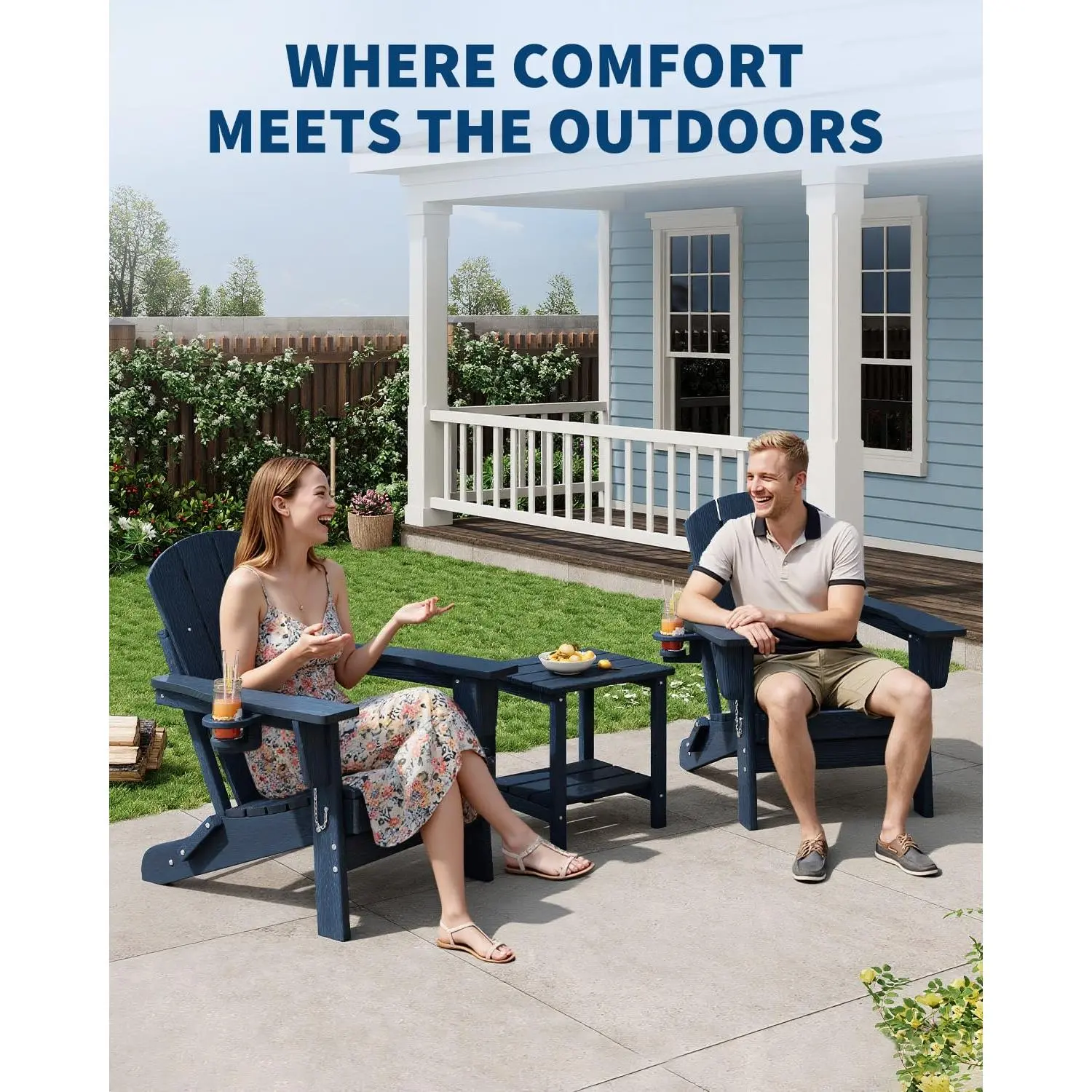 【Classic Wood Look, Modern Durability】These Adirondack patio chairs are crafted from durable HDPE plastic, offering the timeless aesthetic of real wood grain without the maintenance. They resist fading, moisture, and cracking for year-round outdoor use.