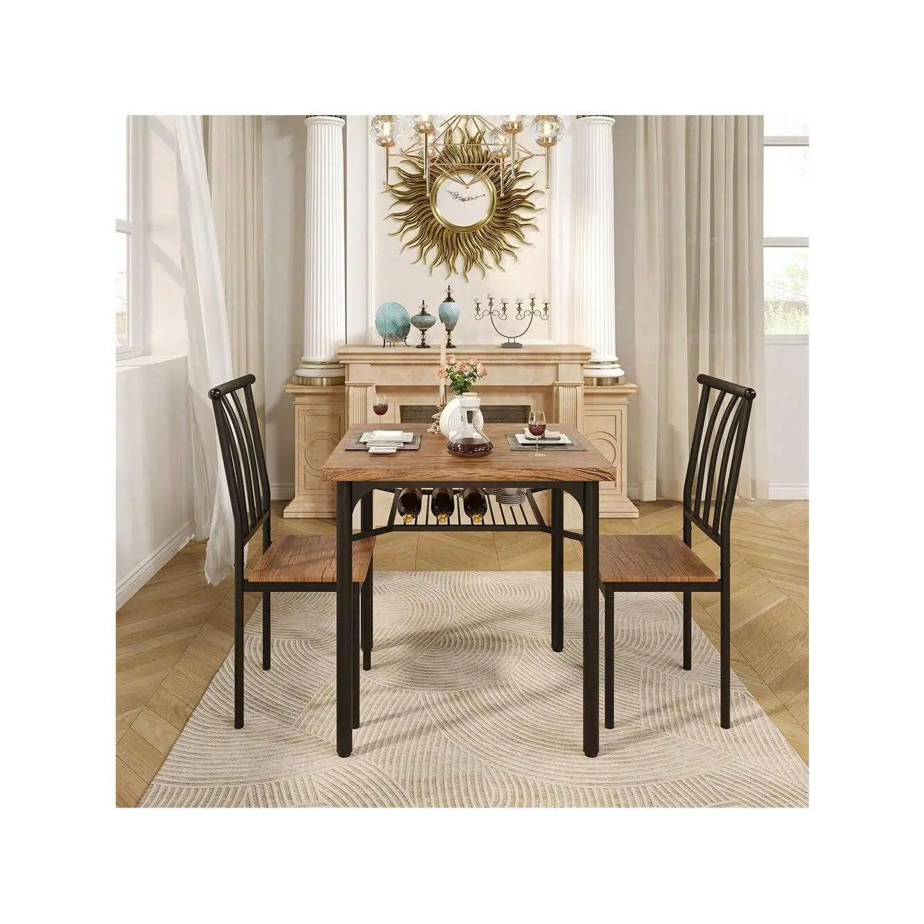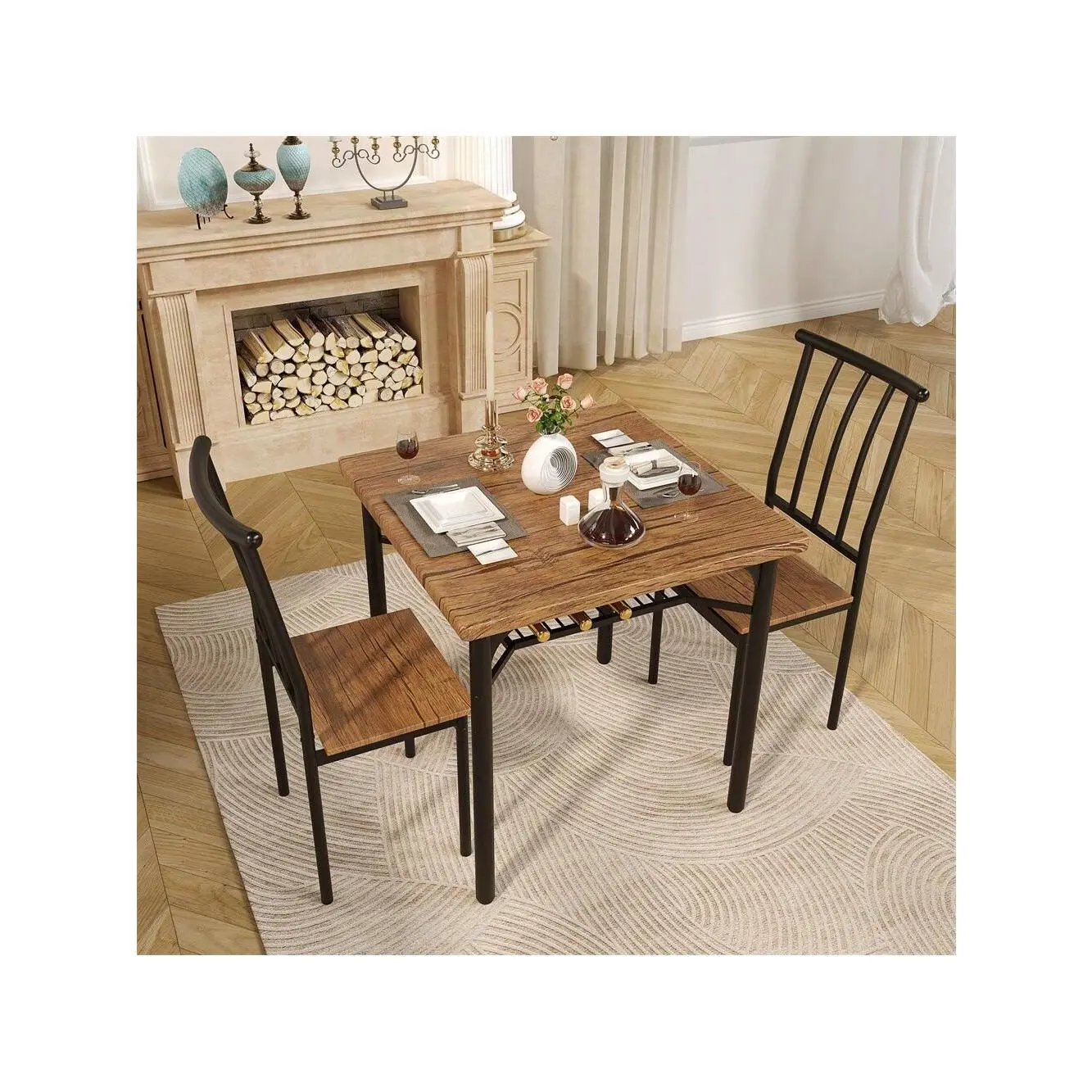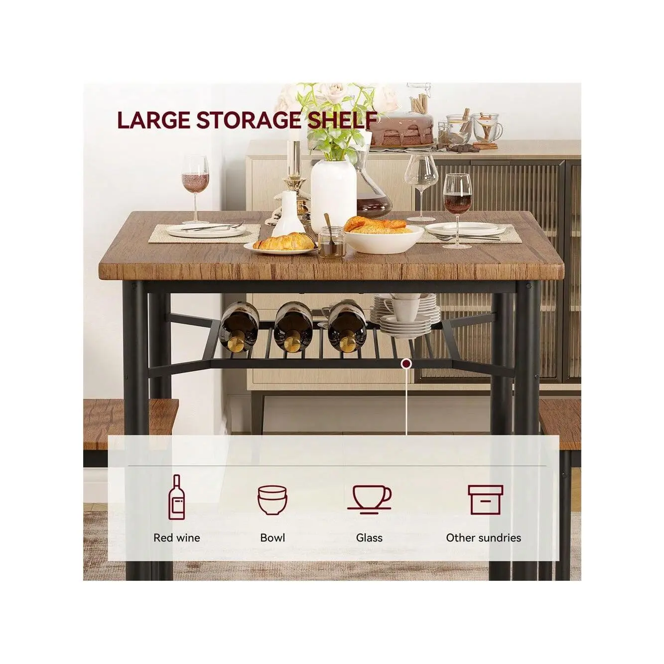 Smart space-saving design features under-table chair storage and a built-in wine rack perfect for organizing essentials in small apartments or dining areas