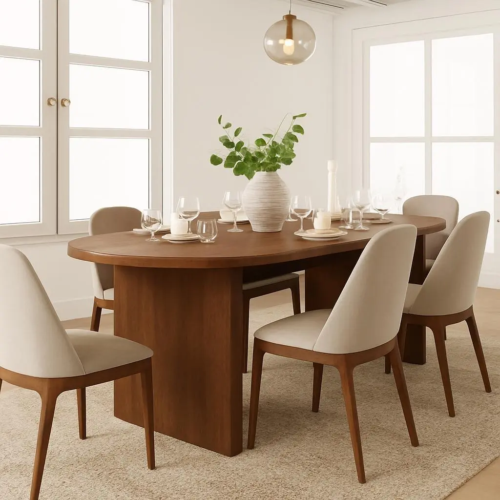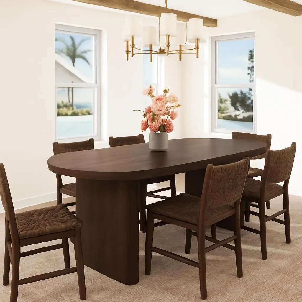 Rustic Farmhouse Style This long wooden dining table features a smooth oval tabletop and two sturdy rounded rectangular legs Its simple yet stylish design is perfect for family meals