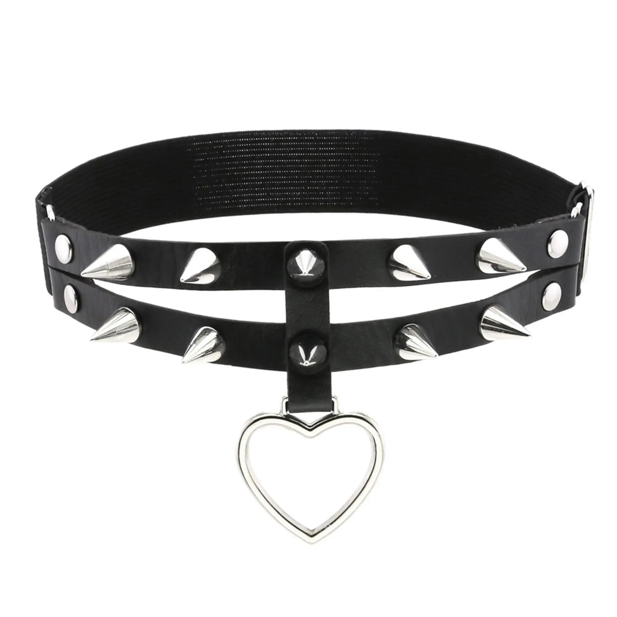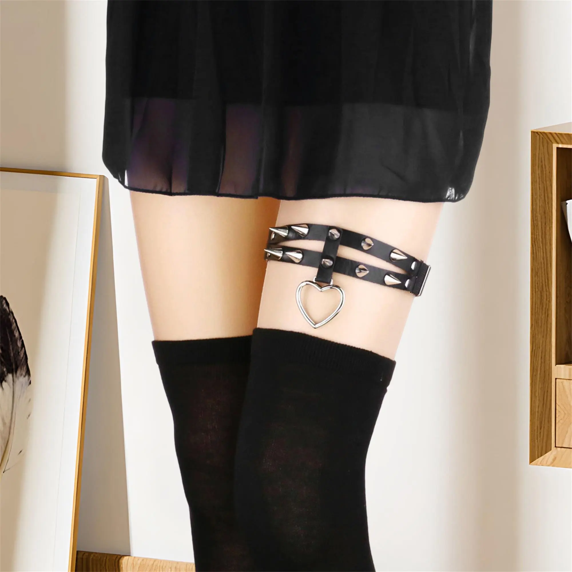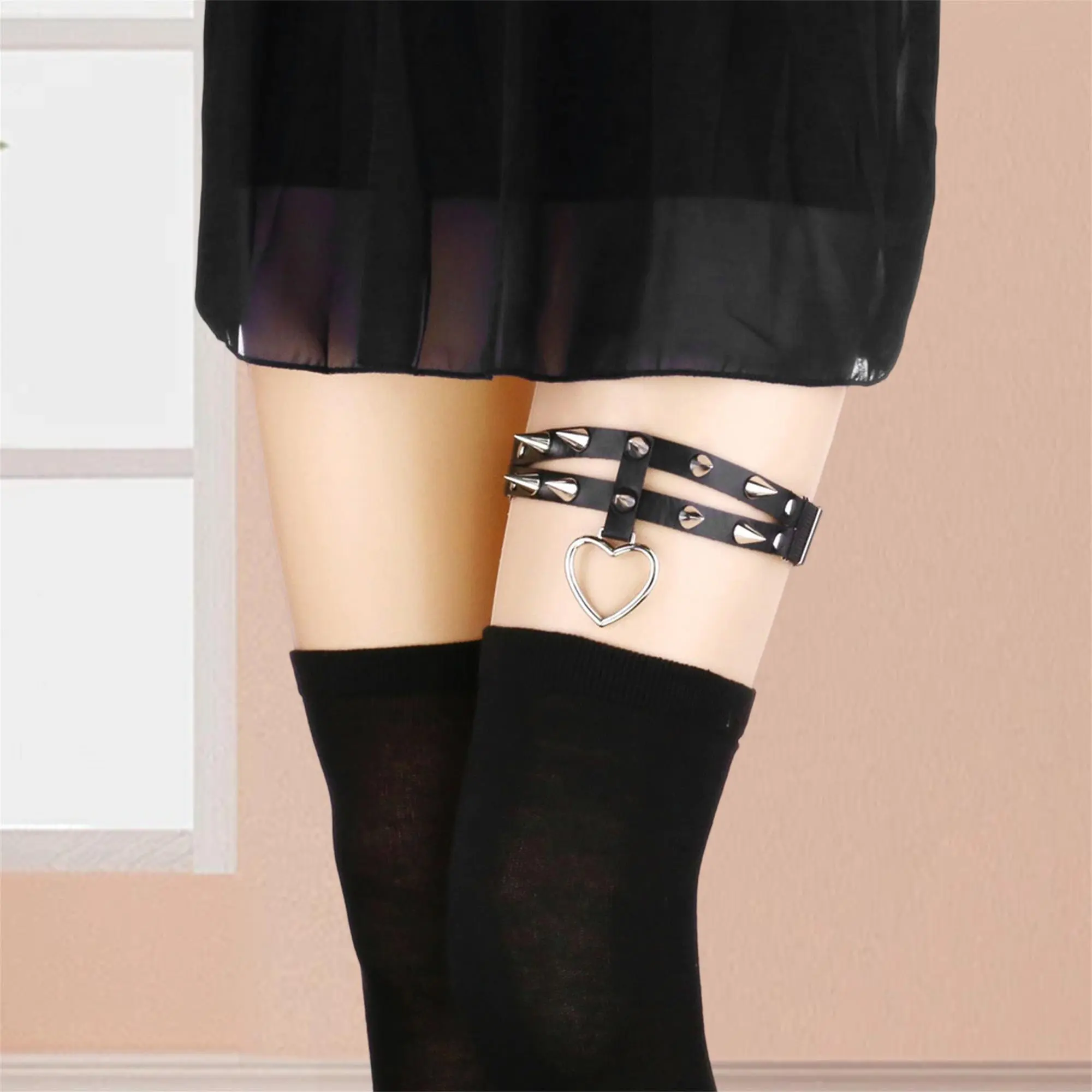 Women Punk Rivets PU Leather Elastic Thigh Garter Leg Ring Heart Shape Leg Harness Belt for Cosplay Party Clubwear