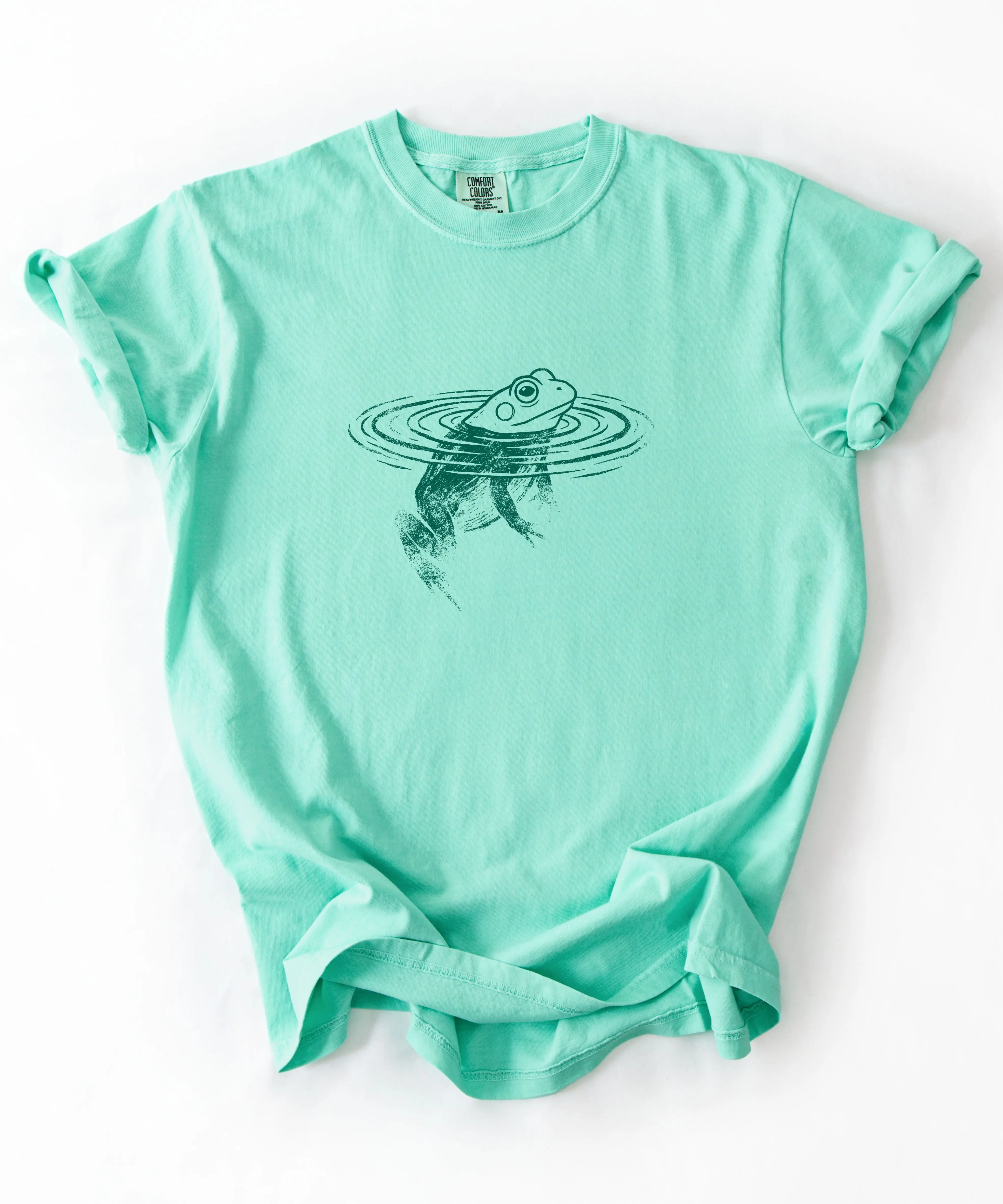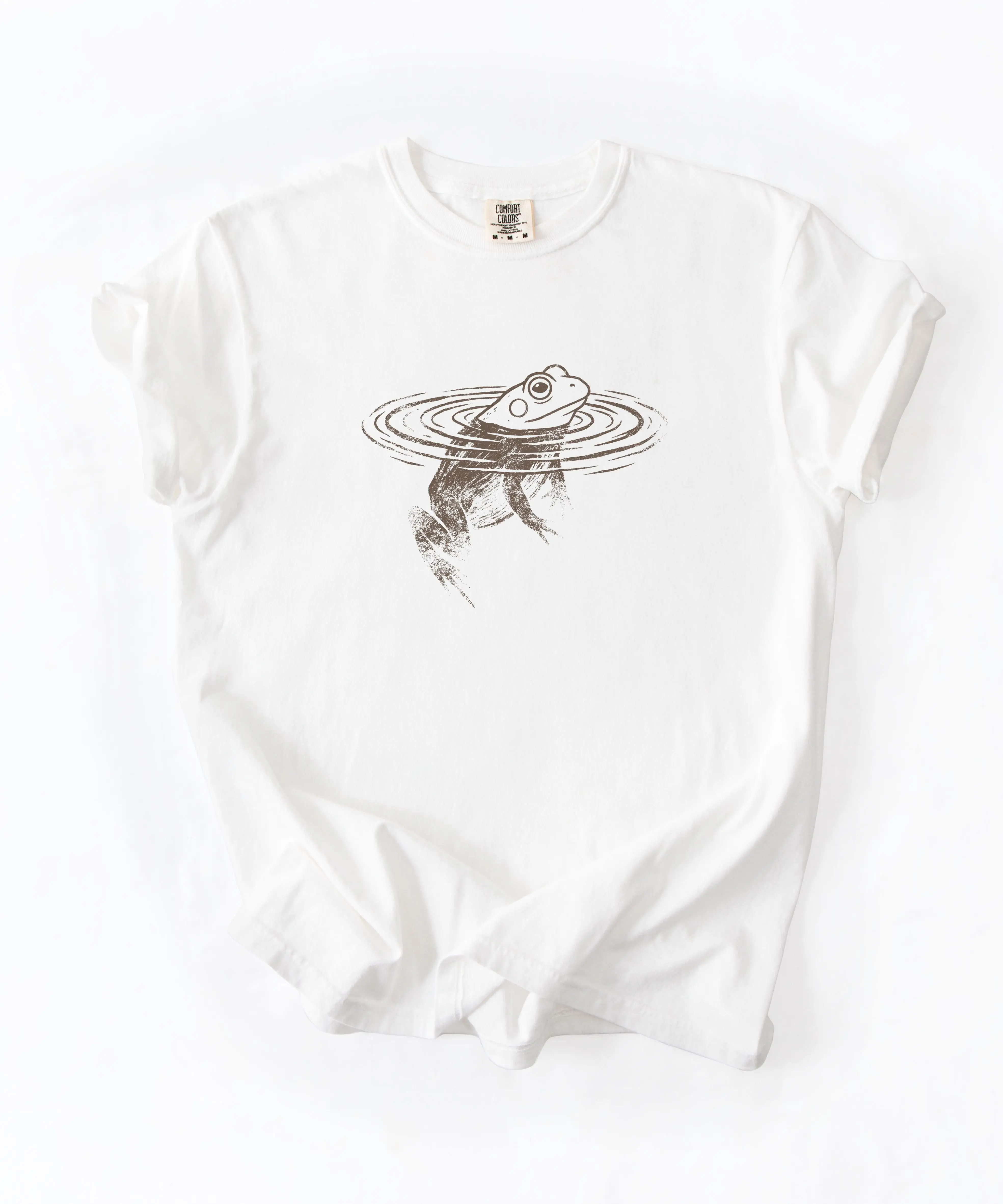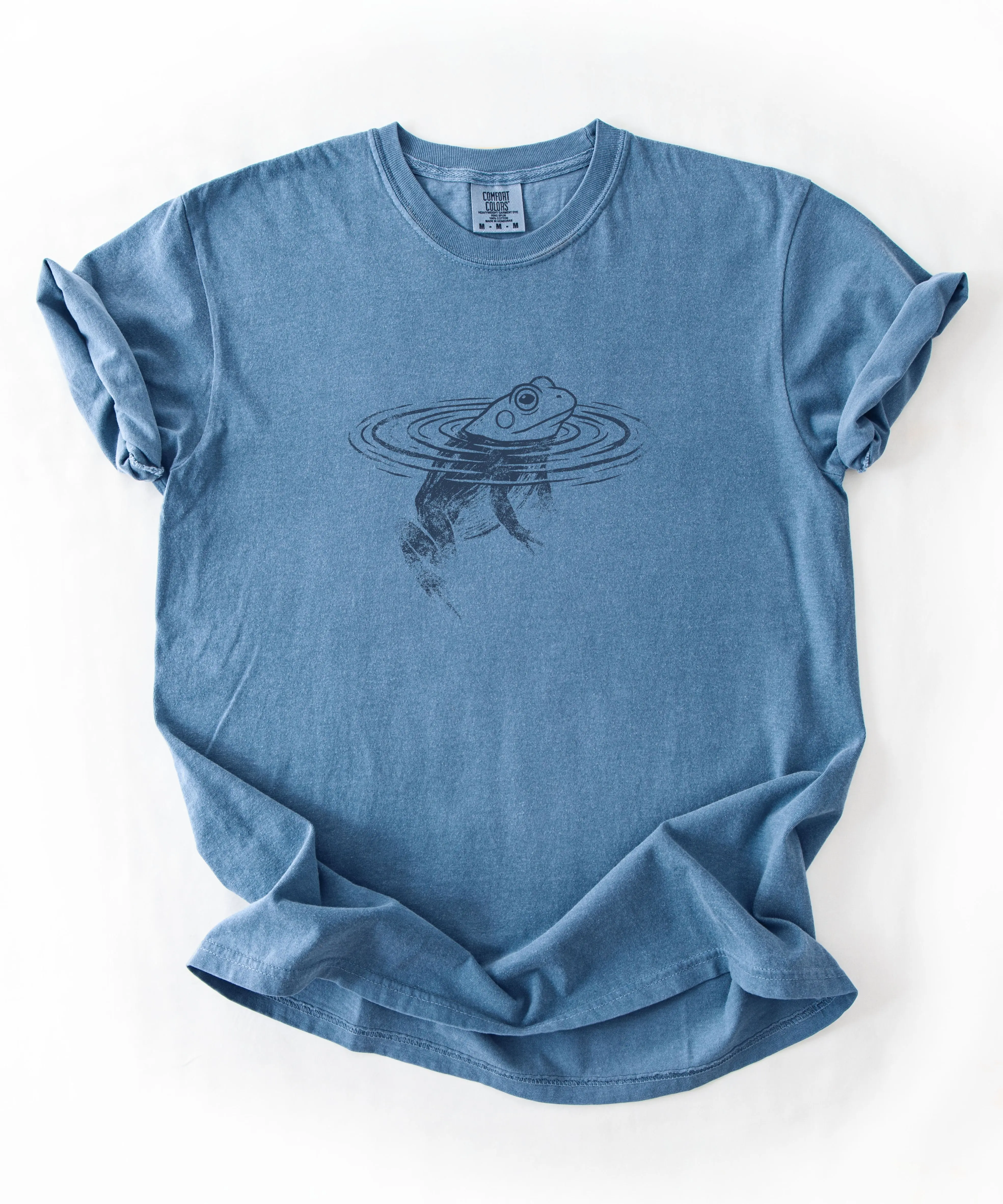 This vintage-inspired swimming frog t-shirt features a minimalist green frog emerging through soft ripples, creating a calm, nature-focused aesthetic with subtle personality. The slightly distressed print gives it a worn-in, outdoorsy feel — perfect for those who appreciate wildlife, cottagecore vibes, and understated graphic art.