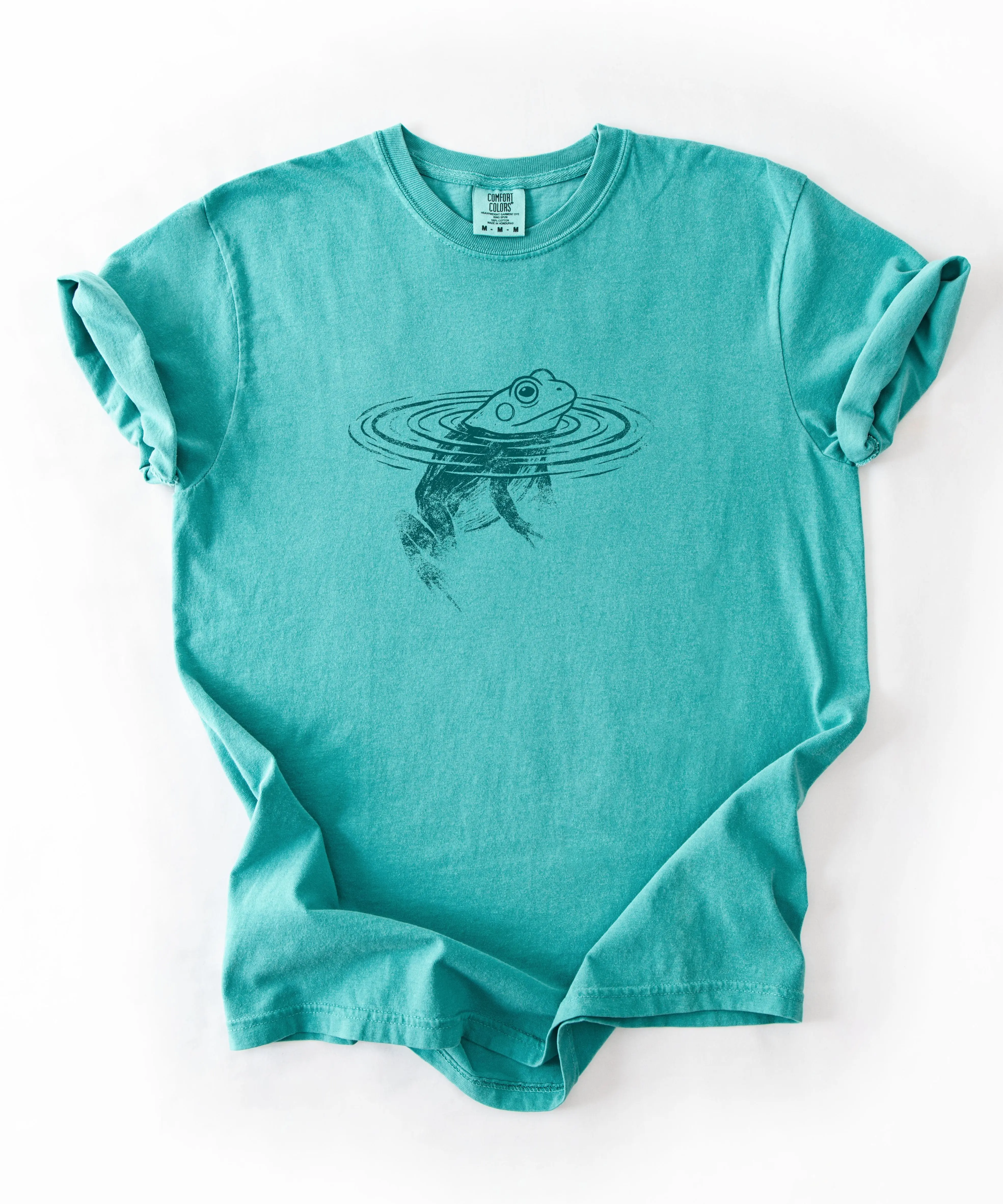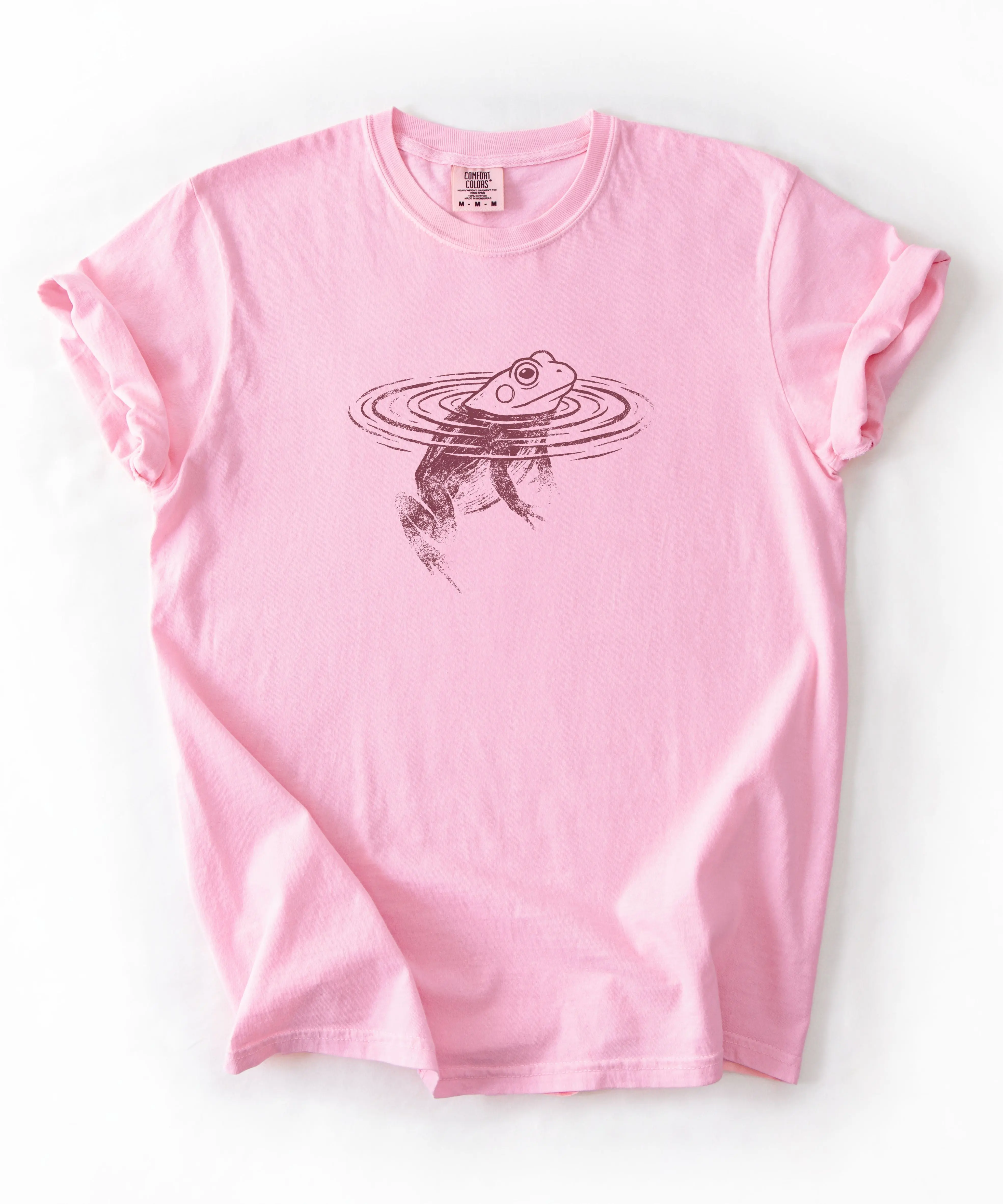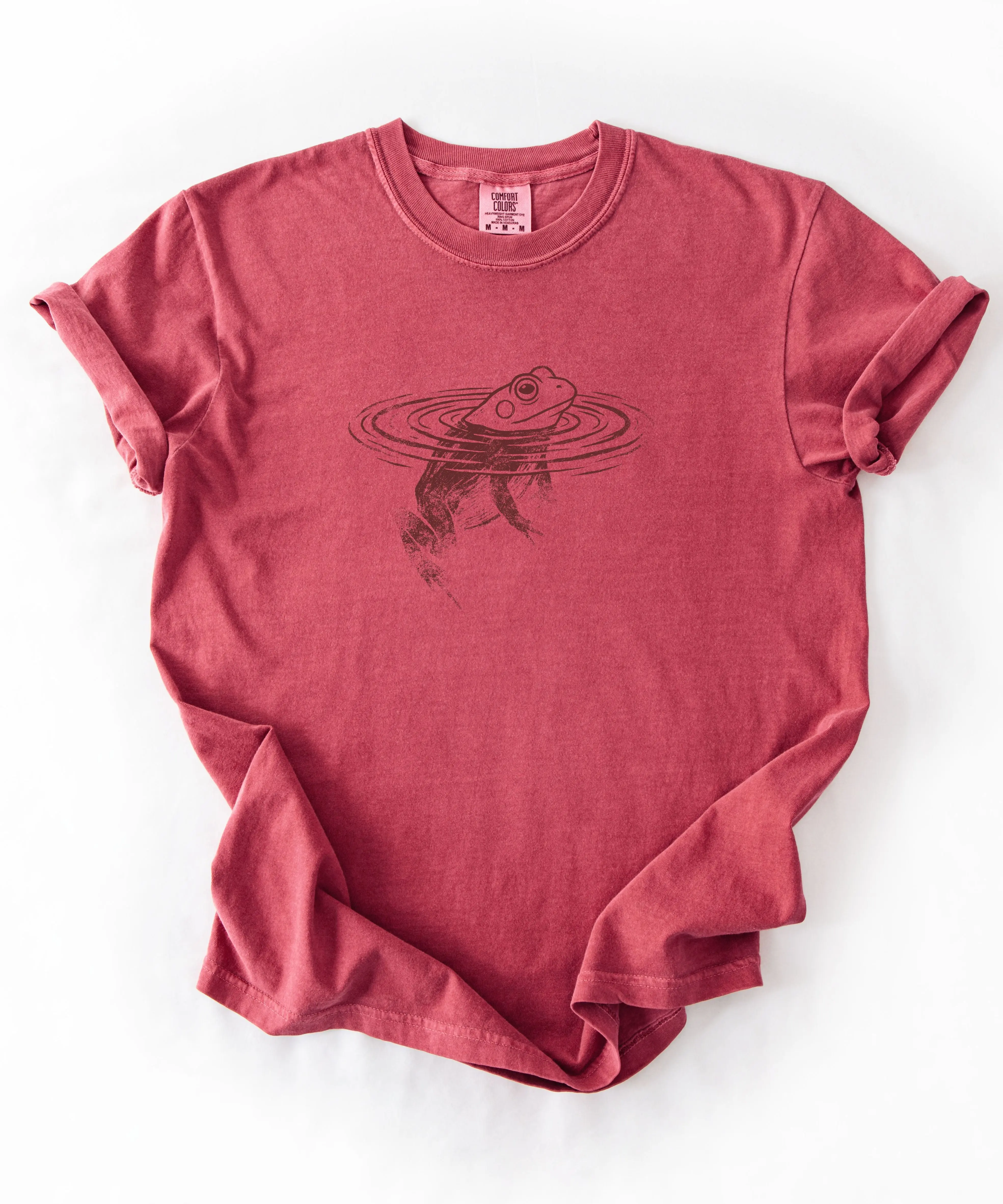 This vintage-inspired swimming frog t-shirt features a minimalist green frog emerging through soft ripples, creating a calm, nature-focused aesthetic with subtle personality. The slightly distressed print gives it a worn-in, outdoorsy feel — perfect for those who appreciate wildlife, cottagecore vibes, and understated graphic art.
