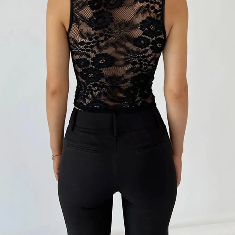 Women s Summer Tank Tops Sleeveless Scoop Neck See-Through Lace Crop Tops Casual Shirts