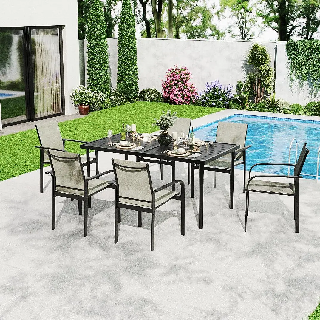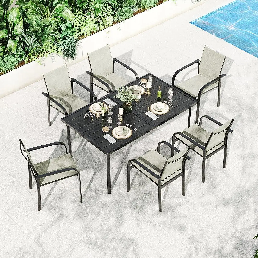 7-Piece Outdoor Dining Set for 6 This patio dining set includes 1 rectangular dining table and 6 matching armchairs, creating a comfortable space for outdoor meals, family gatherings, and weekend entertaining.