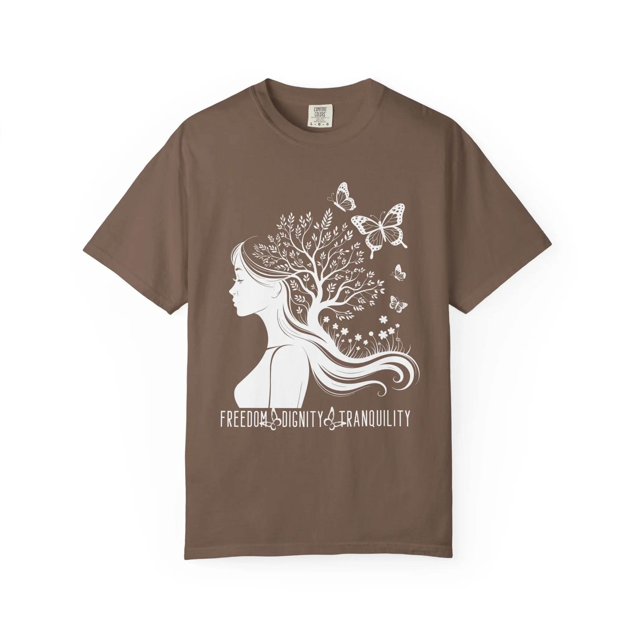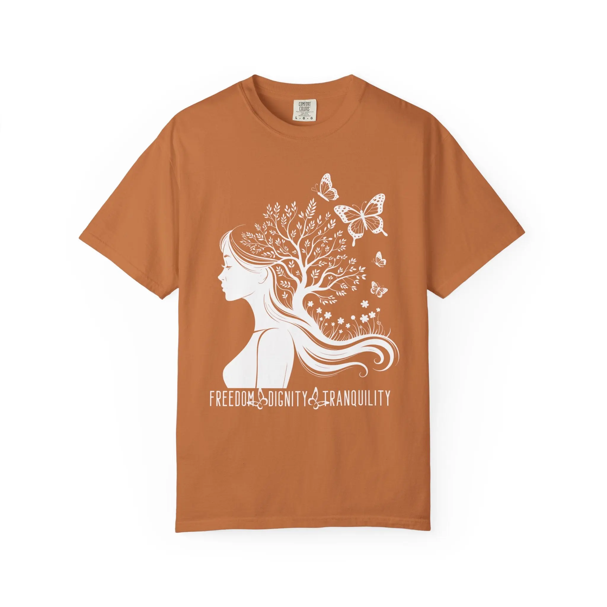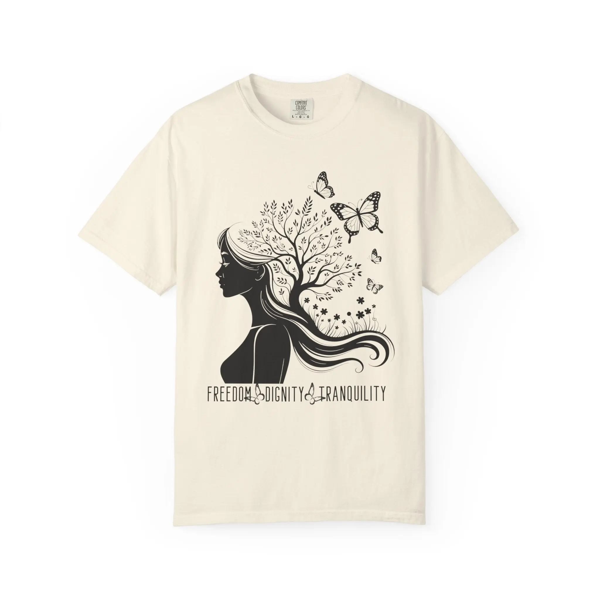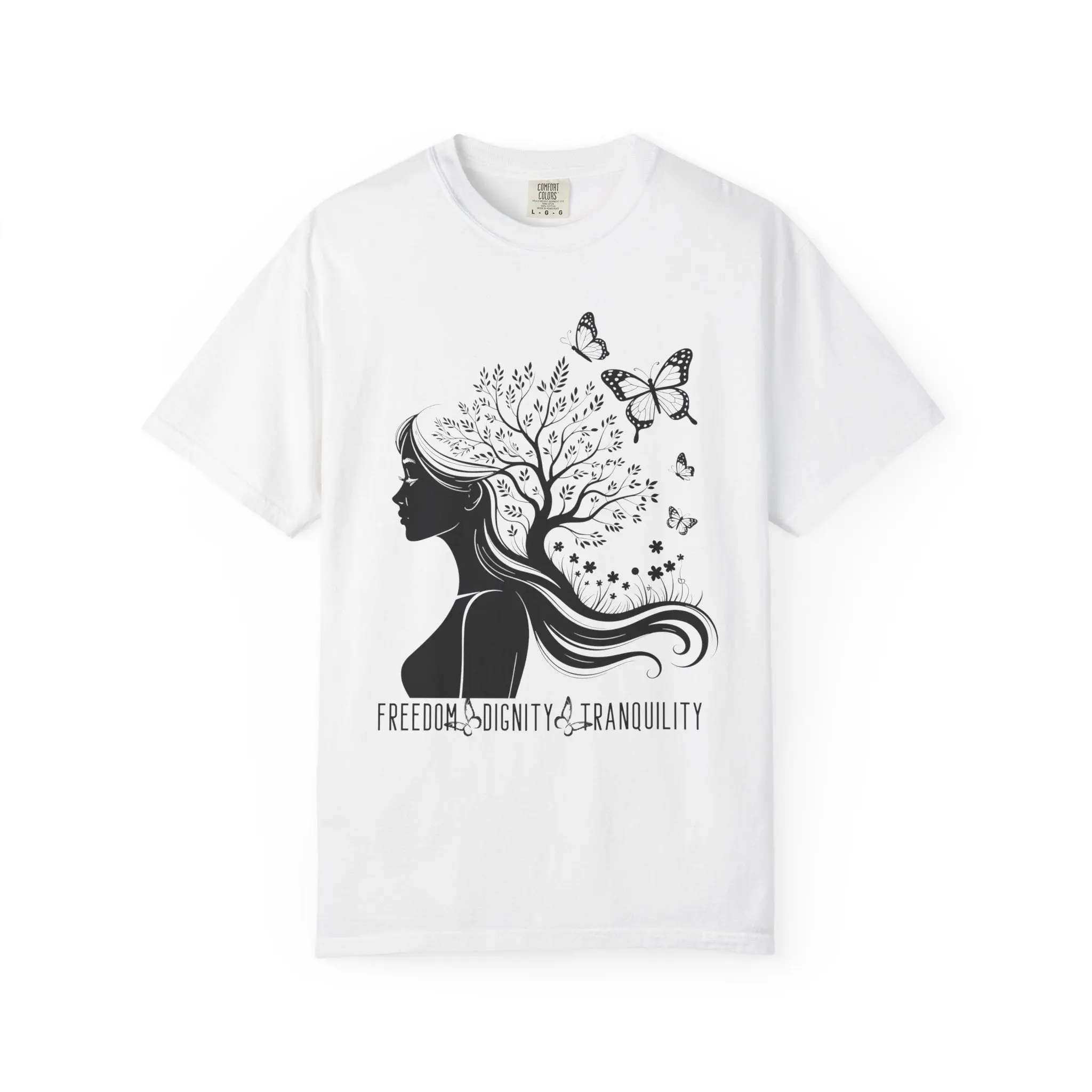 This powerful graphic tee blends feminine resilience with bold conviction. Featuring a woman’s silhouette transforming into a flourishing tree surrounded by butterflies, this design symbolizes growth through adversity and unwavering commitment to freedom, dignity, and peace.
