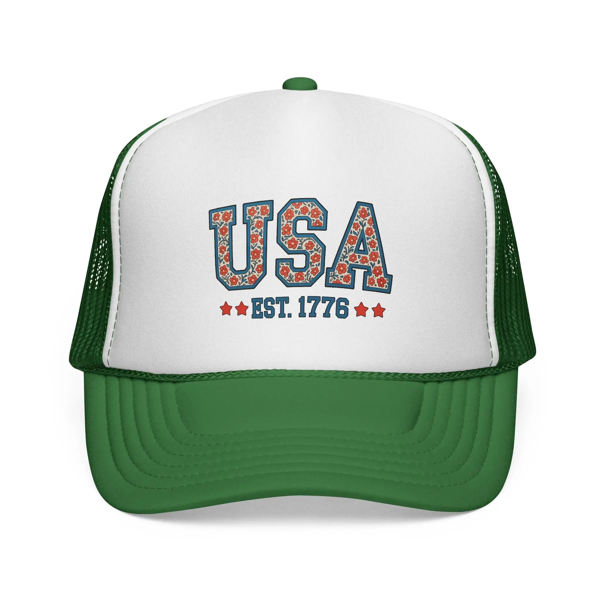 This trucker cap brings a sunny, backyard BBQ energy to any casual outing. Lightweight foam front and breathable nylon mesh back keep air flowing on hot days while the adjustable snap lets you dial in a comfortable fit. The front panel features a vintage-inspired “USA” design with subtle floral patterning and EST. 1776—an easy nod to Americana that pairs well with denim, warm afternoons, and small-town parades. Bright, color-matched details and six-row stitching on the visor give a finished look that resists fading through repeated wear. It unpacks with a natural crease that relaxes as you wear it, so it quickly becomes part of your go-to rotation for summer gatherings, holiday cookouts, and road trips.