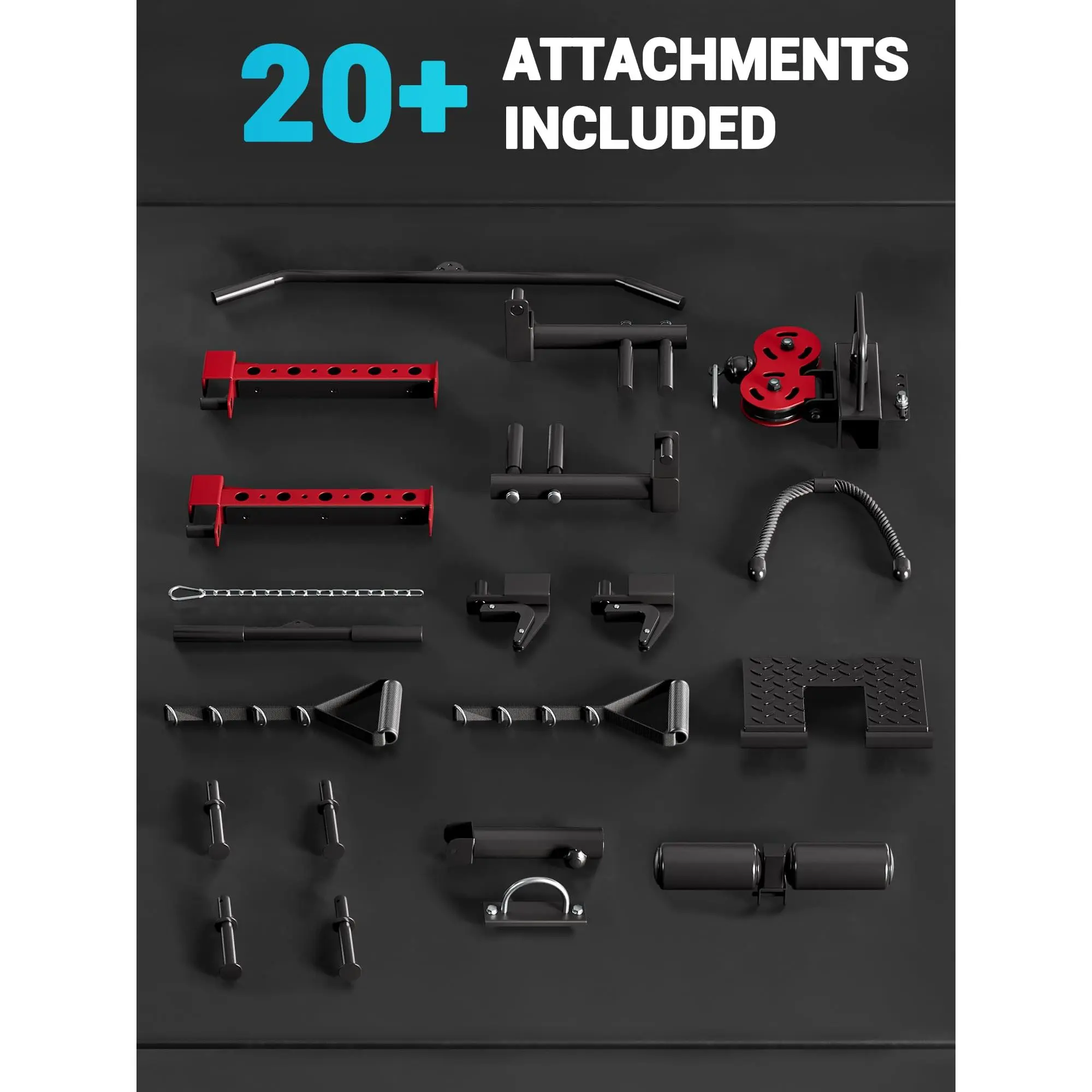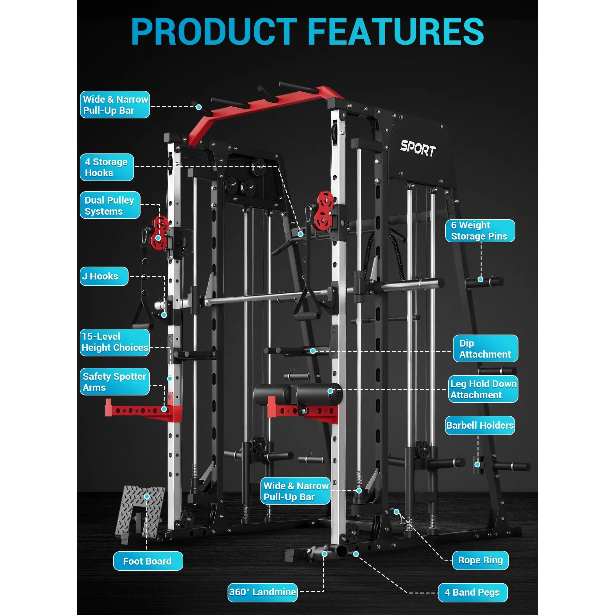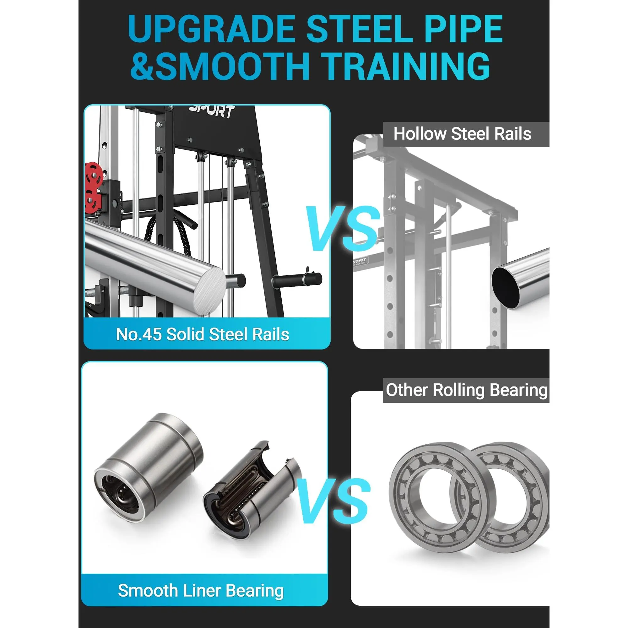 【Smooth Cable & Smith Bar System】Equipped with PU-coated cables, precision pulleys, and solid steel guide rails for quiet, fluid movement. Features 15 adjustable height positions to support a wide range of workouts including lat pulldowns, rows, curls, presses, and flys.