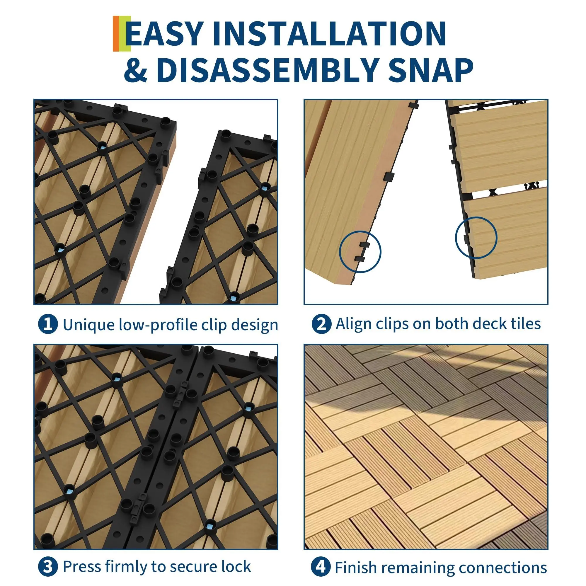 5,【Safe, Anti-Slip & Weather-Resistant]:The textured wood-grain surface provides reliable slip resistance, even when wet, making these tiles a safe choice for pool decks and other high-moisture areas. Built to withstand sun, rain, wind, and heat, they remain durable and stable across seasons, offering a dependable and attractive surface year-round.