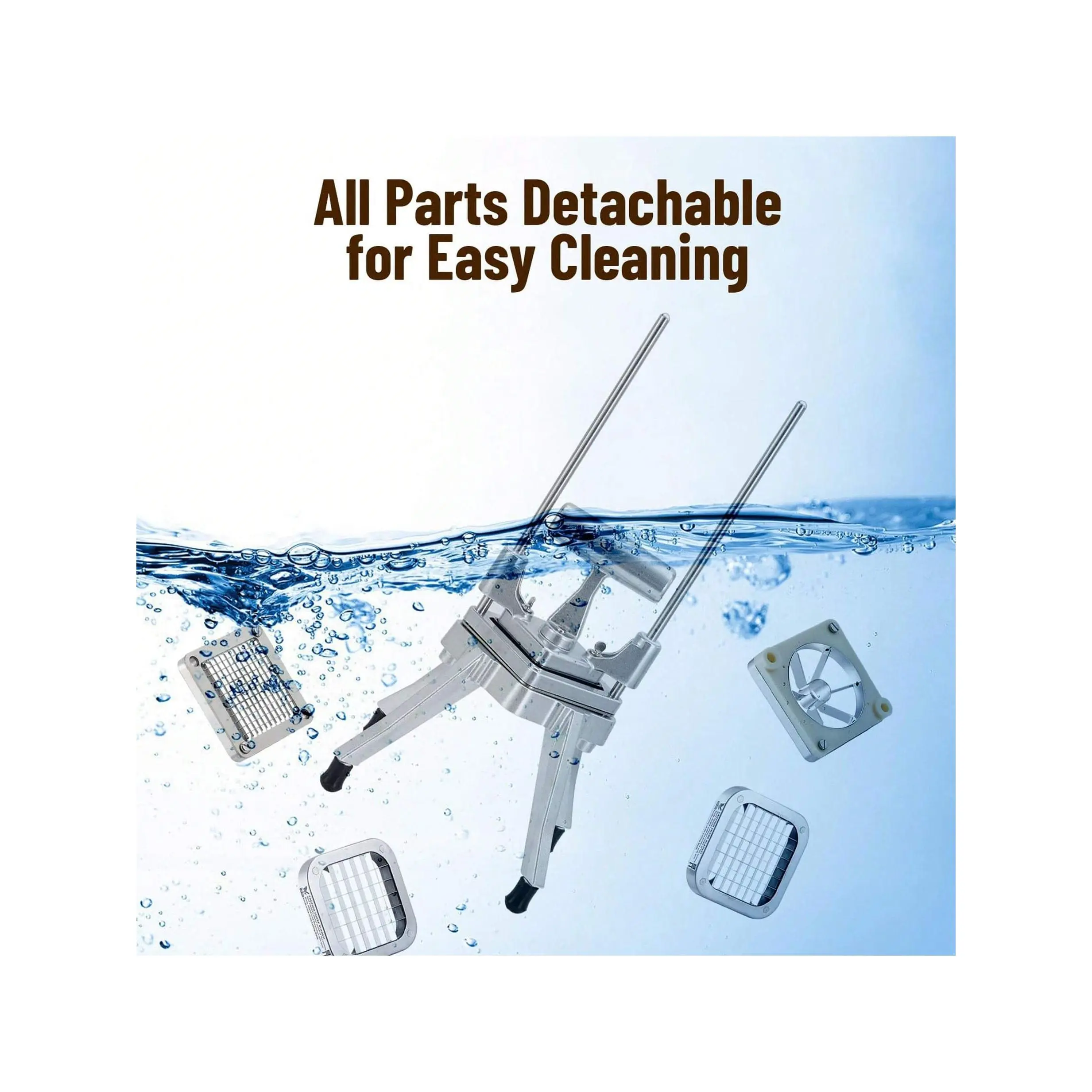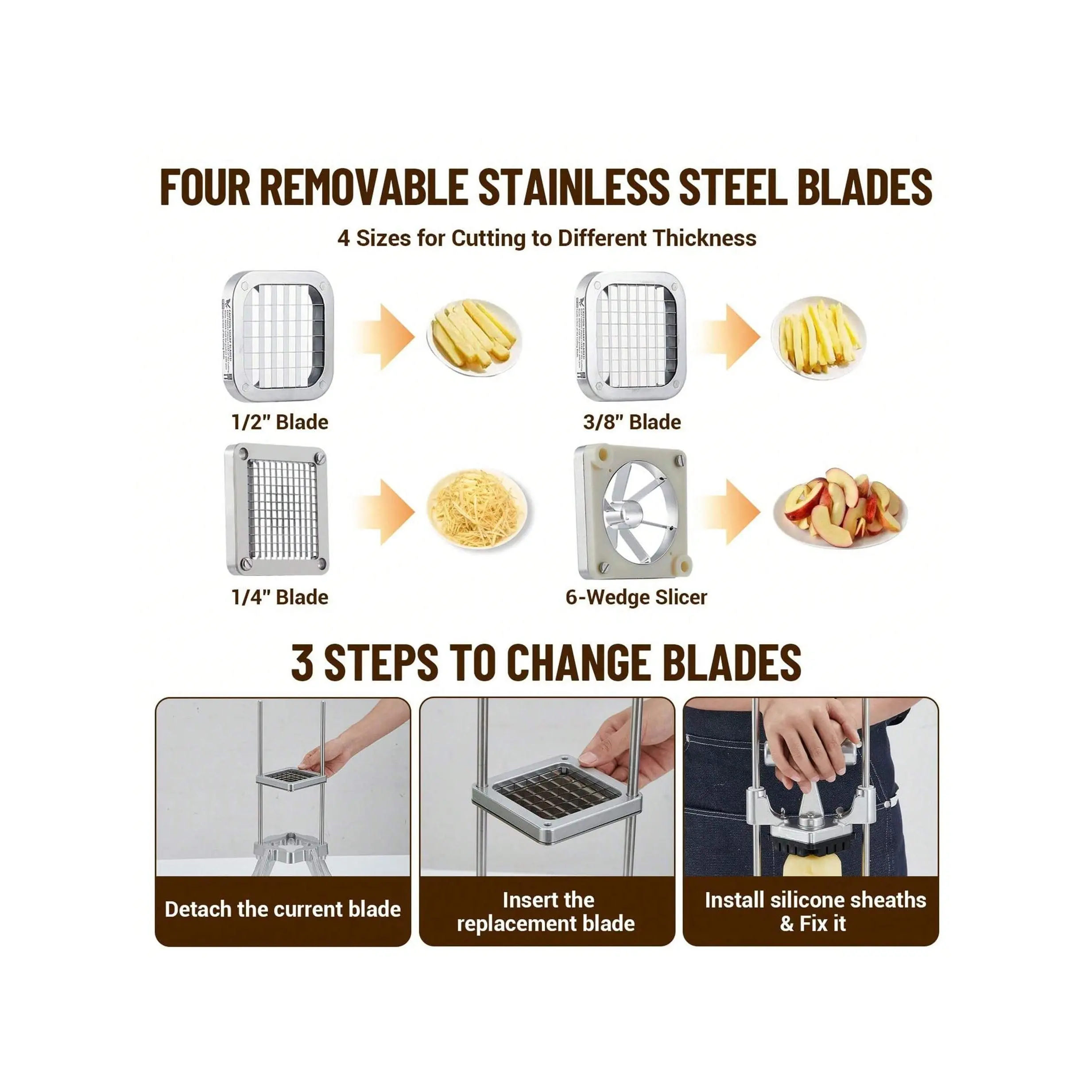 Four Interchangeable Blades: This chopper is equipped with four durable stainless steel blades (1/2", 3/8", 1/4", and 6-wedge) that allow you to customize your cutting style, whether you're dicing vegetables or slicing fruits.