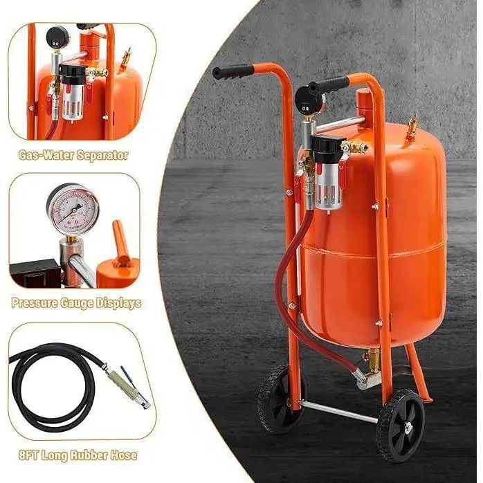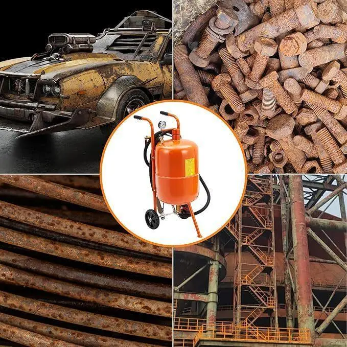 Portable & Convenient Mobility: Designed with two 6-inch rubber wheels for effortless movement, this portable abrasive blasting machine is ideal for outdoor rust removal projects, while the 8 ft hose allows easy access to hard-to-reach areas