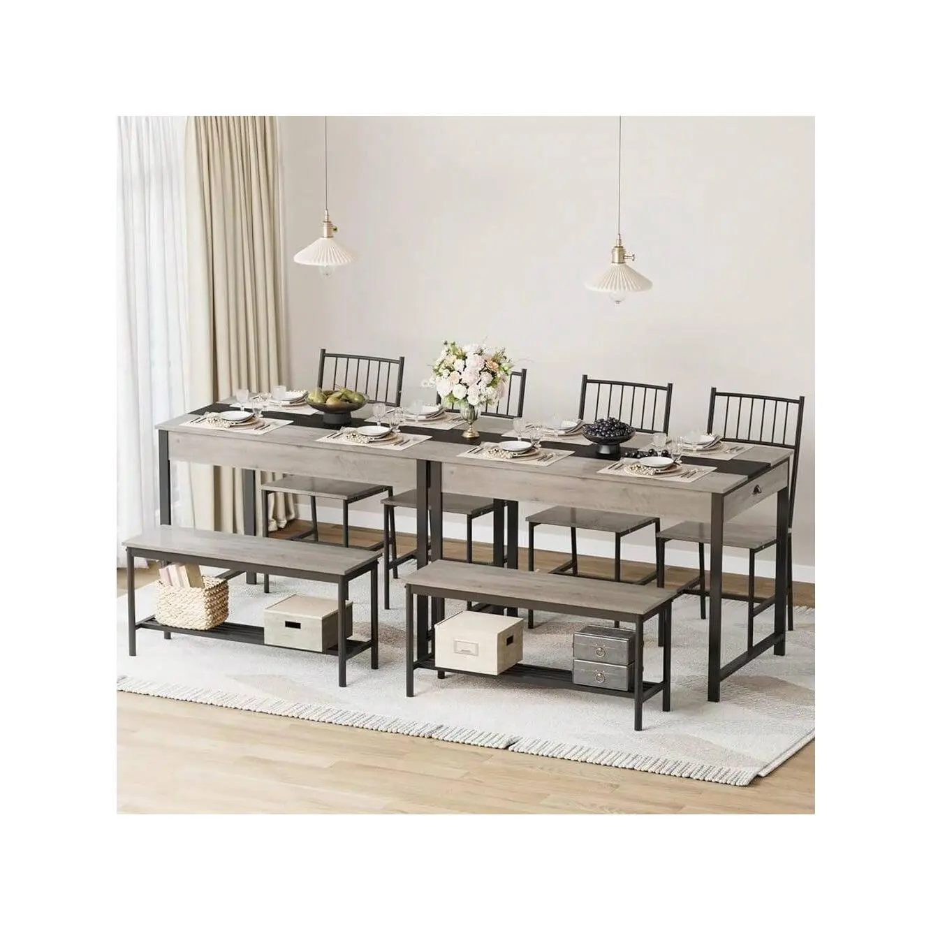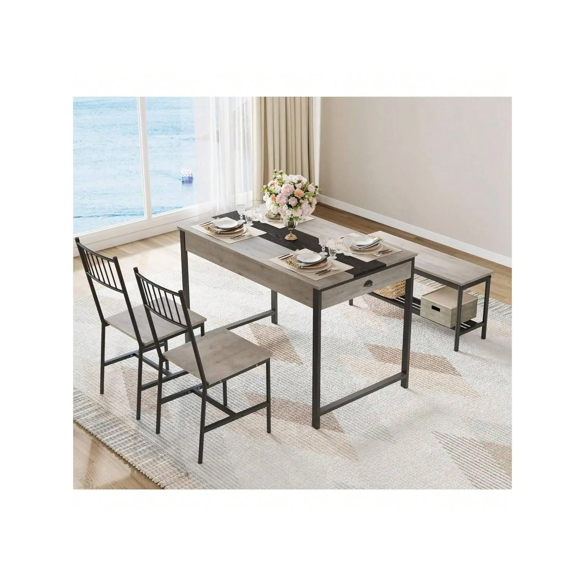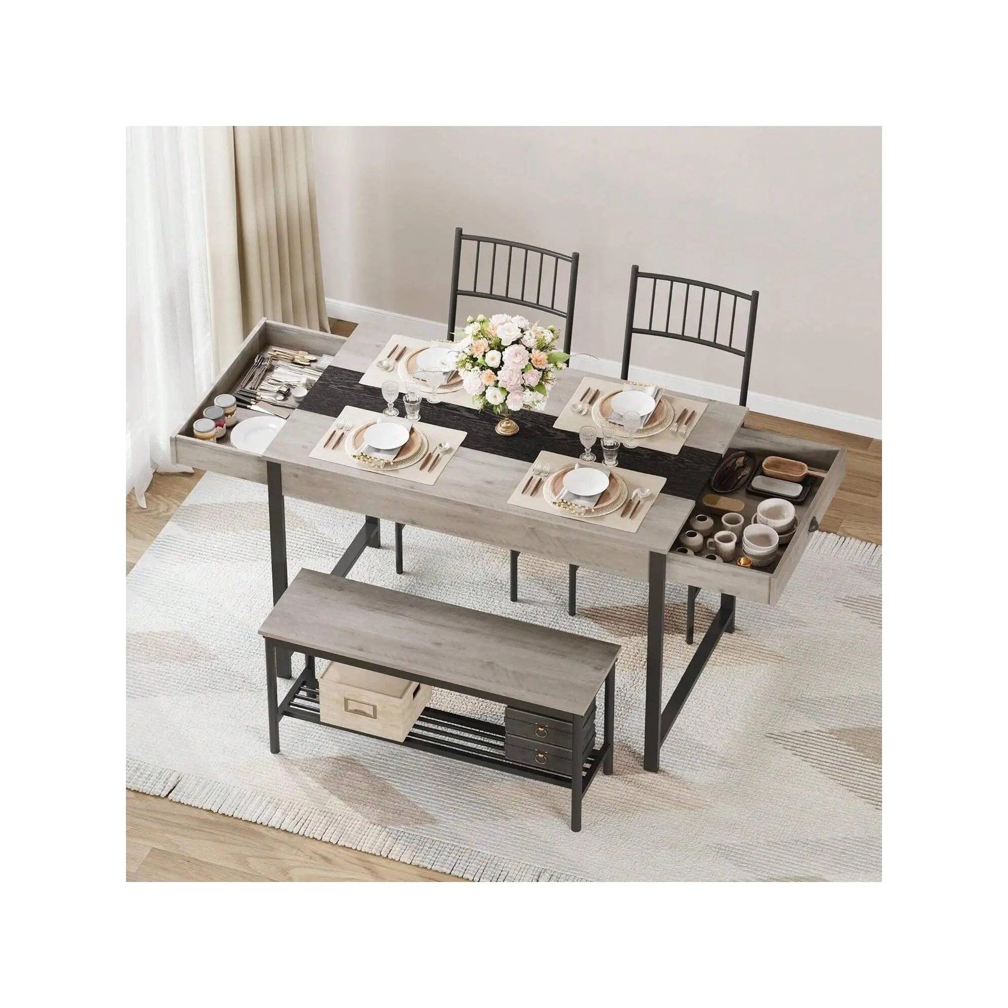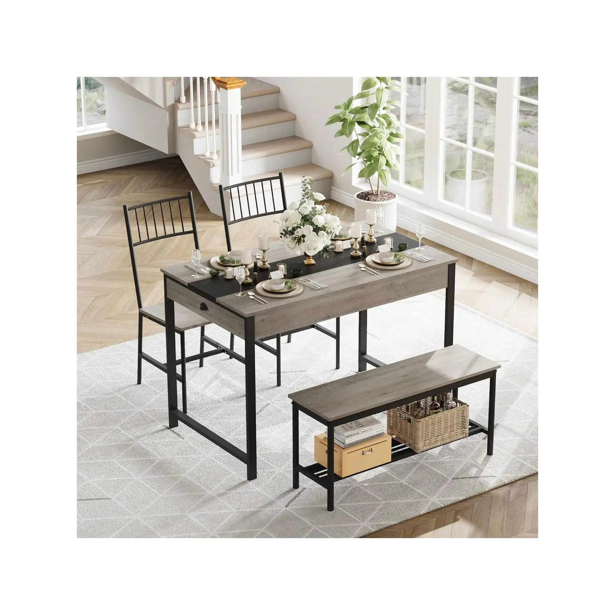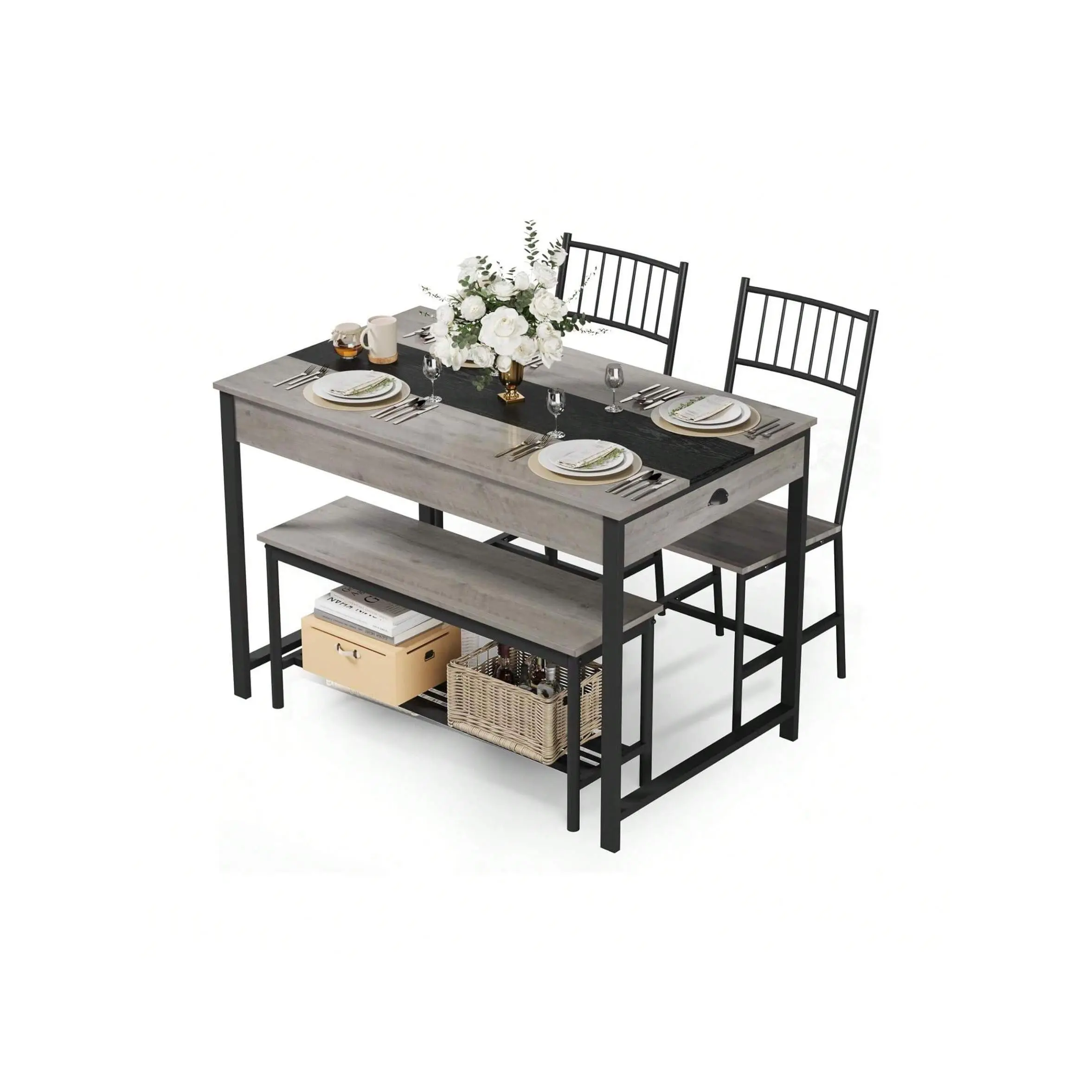 Space-saving design with chairs and bench storable under the table perfect for small spaces to keep your home tidy and organized while offering ample seating for four