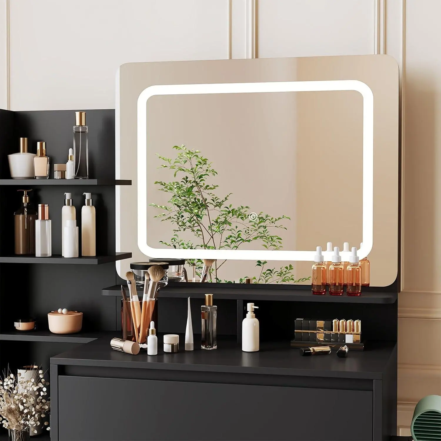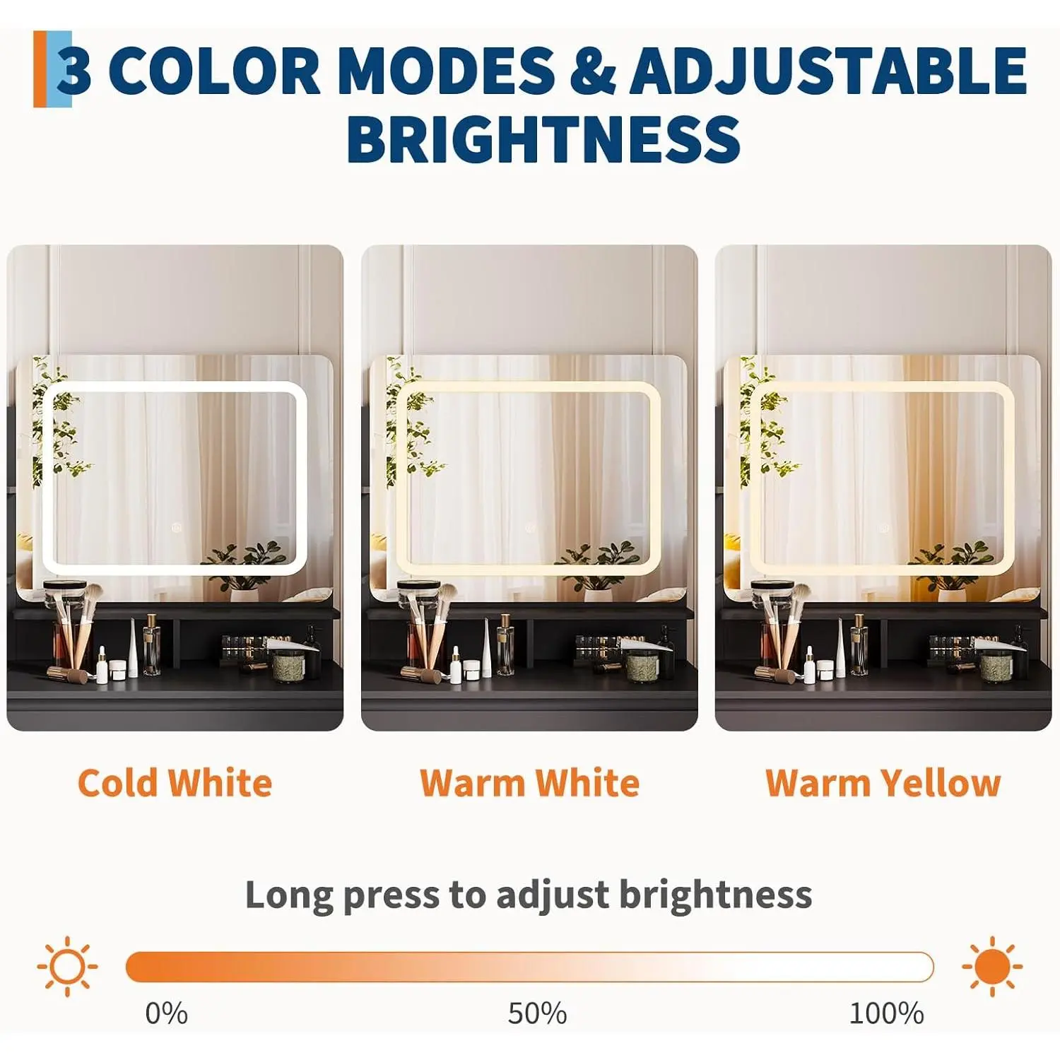 Makeup Vanity with Lights - 36-Inch Vanity Desk - 4 Large Drawers Dresser - 3 Lighting Modes - Stool and Charging Station - Modern Vanity Table for Bedroom - Women - Black