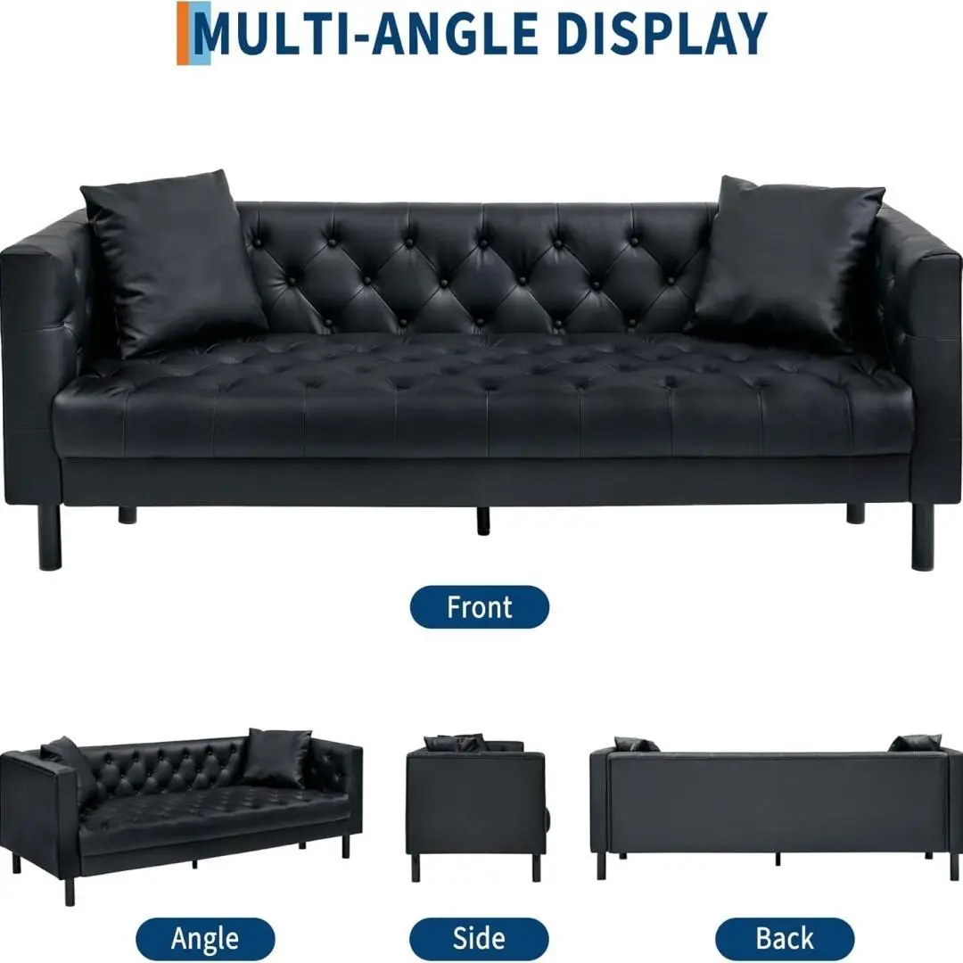 Black Mid Century Modern Leather Sofa Chesterfield Style Deep Seats Includes 2 Pillows 3 Seater Button Tufted for Living Room Apartment Office Buttontufted Styling Highresilience Pocket Springs