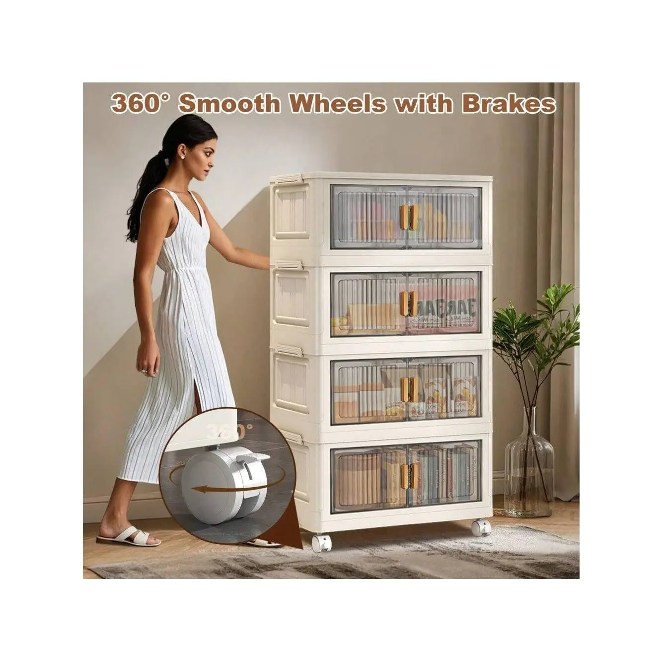 Stackable & Removable: The storage organizer bins are stackable and mobility. Each layer has matching grooves and clasps on both sides of the top to securely lock the clear storage bins. There are four rotating wheels at the bottom, which makes it easy for you to move.