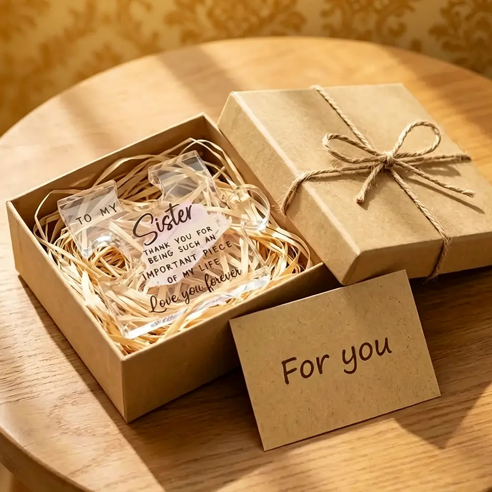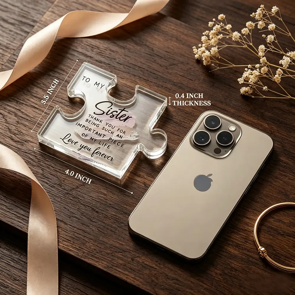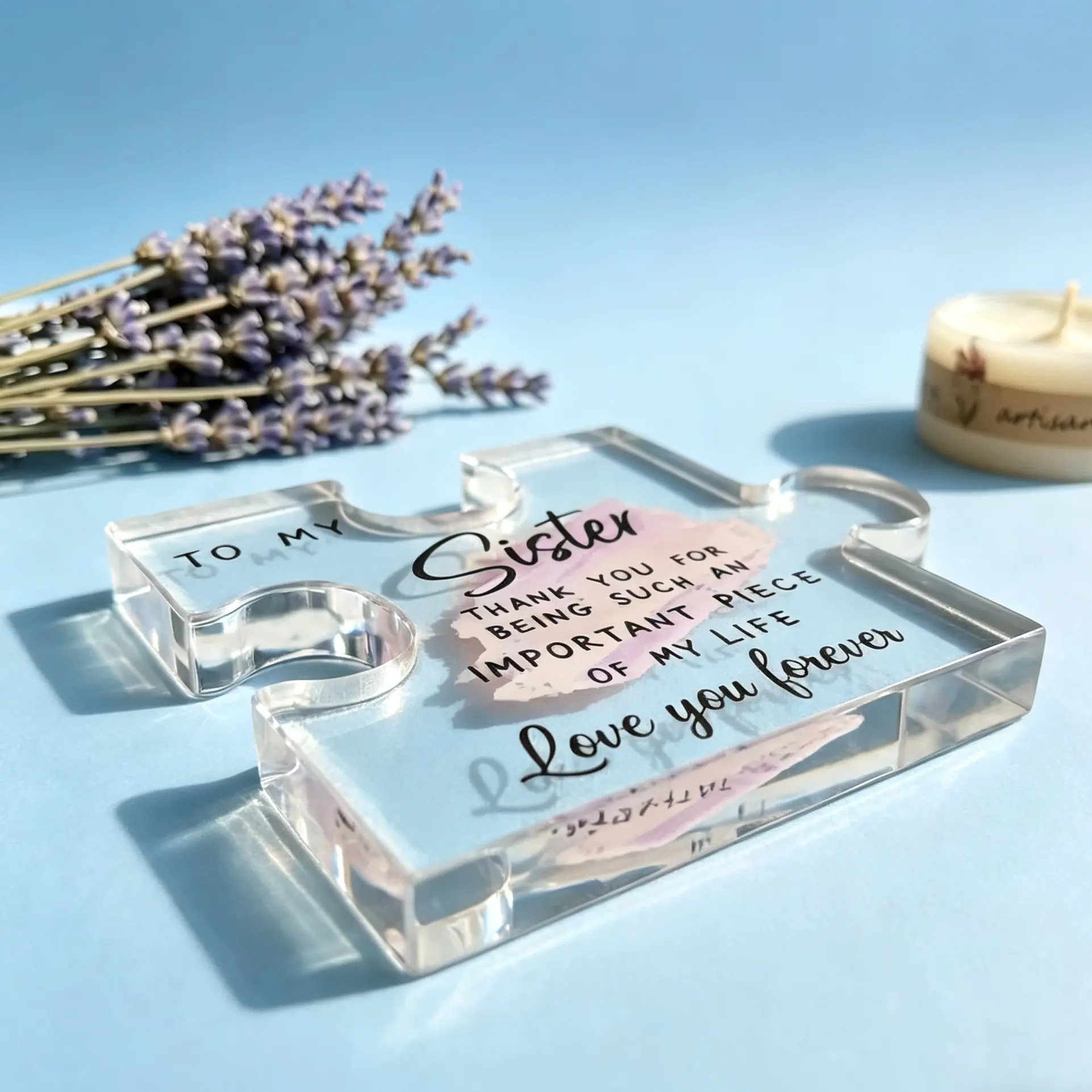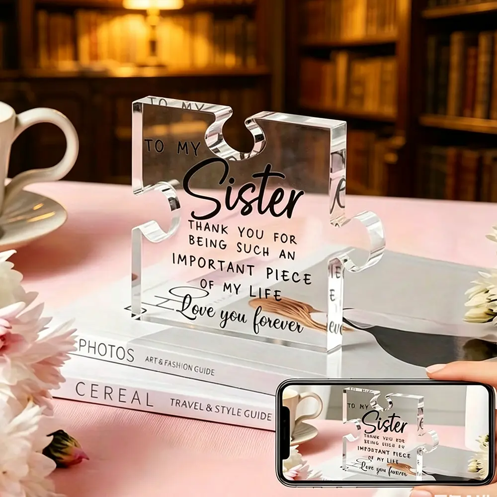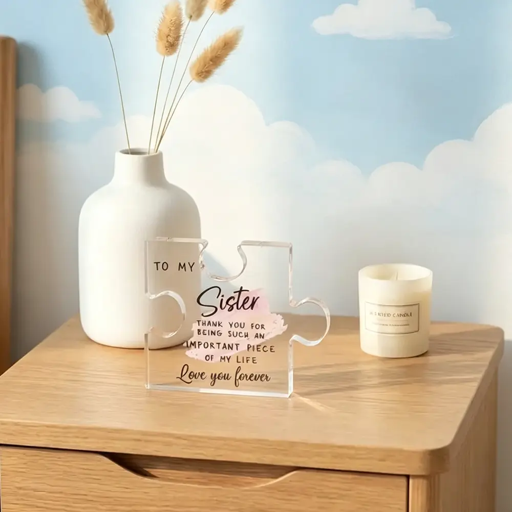 Celebrate the bond between sisters and best friends with this flat 2D acrylic jigsaw plaque.This product is a 2D acrylic desktop ornament, not a 3D model or figurine.Designed as a compact and delicate keepsake, it is ideal for desktop display, small spaces, and decorative use.
