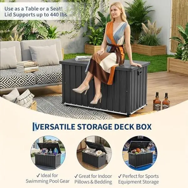 Waterproof & Weather Resistant Protection: Designed as a waterproof deck box and weather resistant storage container, it helps shield contents from rain, humidity, dust, and outdoor exposure, making it ideal for outdoor cushion storage, seasonal décor, and backyard poolside storage year-round.