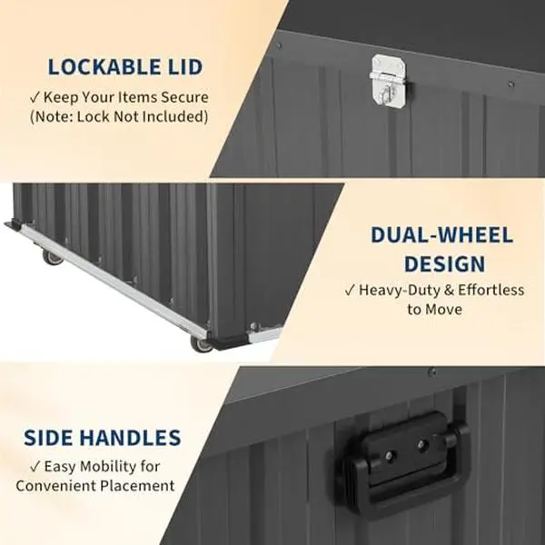 Easy to Move, Easy to Use: Unlike bulky stationary bins, this rolling storage box with wheels includes built-in side handles for convenient movement around your deck, garden, porch, or pool area. It works perfectly as a garden tools organizer or flexible storage solution for changing outdoor layouts.