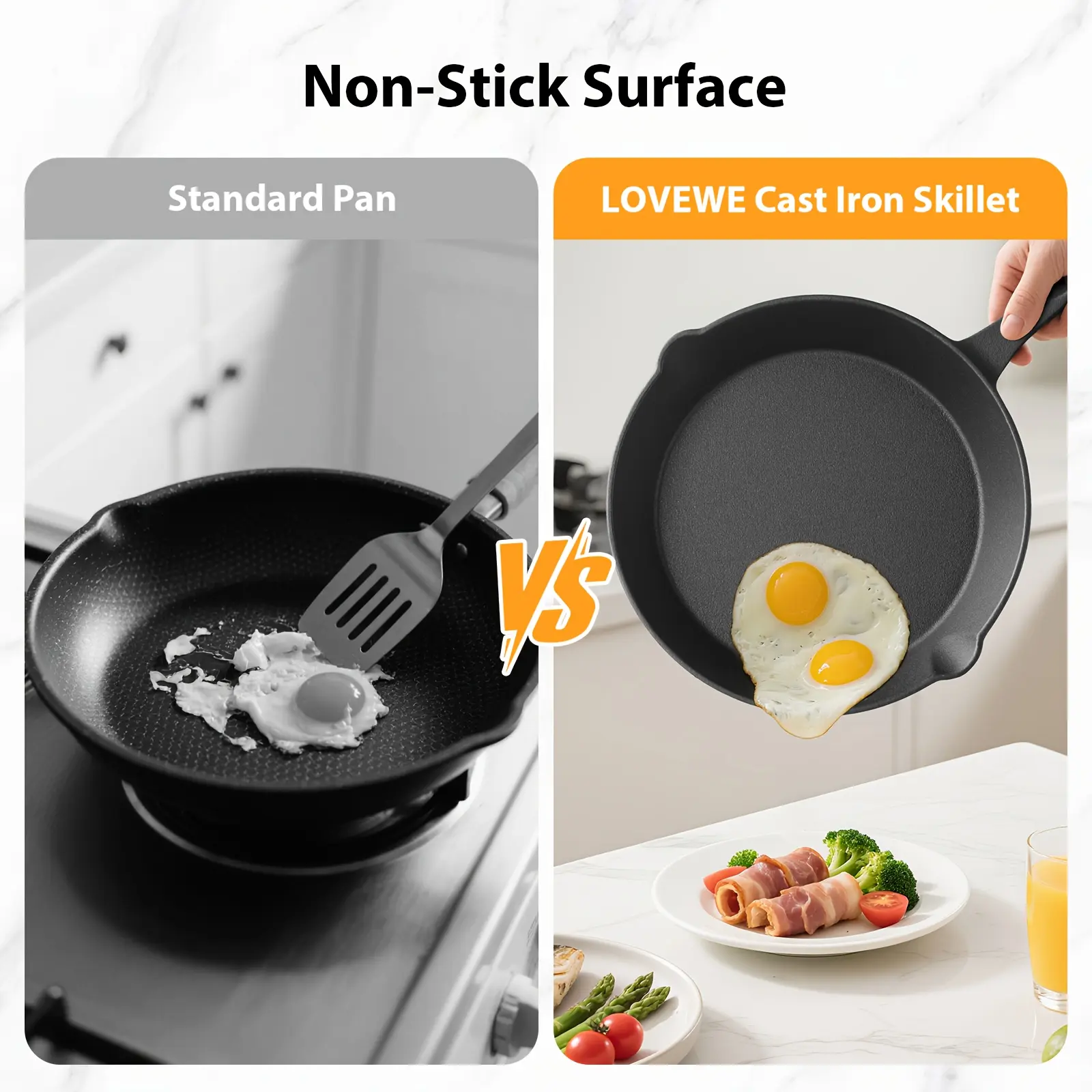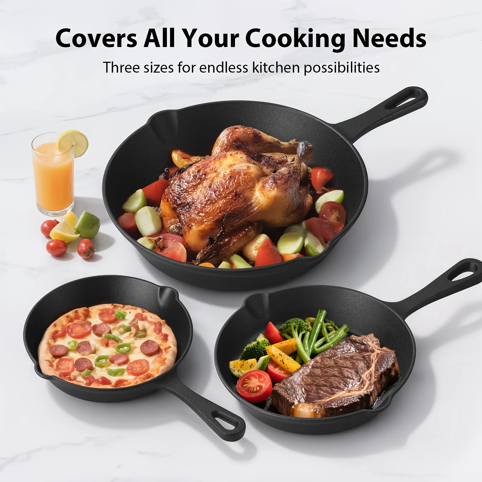 Cast Iron Skillet, Heavy-Duty Professional Restaurant Chef Quality Pre-Seasoned Pan Cookware Set, for Frying, Saute, Cooking, Use Indoor/Outdoor, Oven, Grill