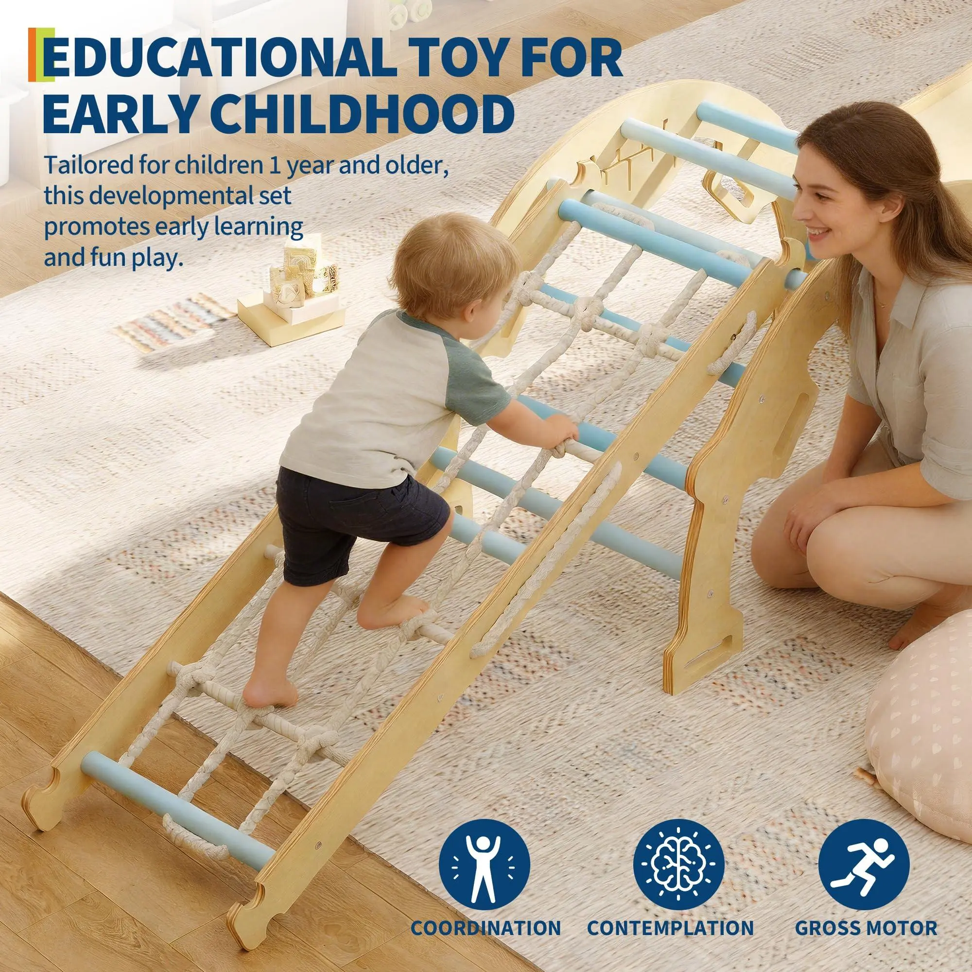 Premium Wood Construction- Crafted from high-quality thickened wood, every surface of this montessori play gym is polished to a smooth, burr-free finish. Rounded edges protect delicate skin during play, while the sturdy build withstands energetic toddler climbing toys action. The natural wood texture also adds a warm, aesthetic touch to your home decor.