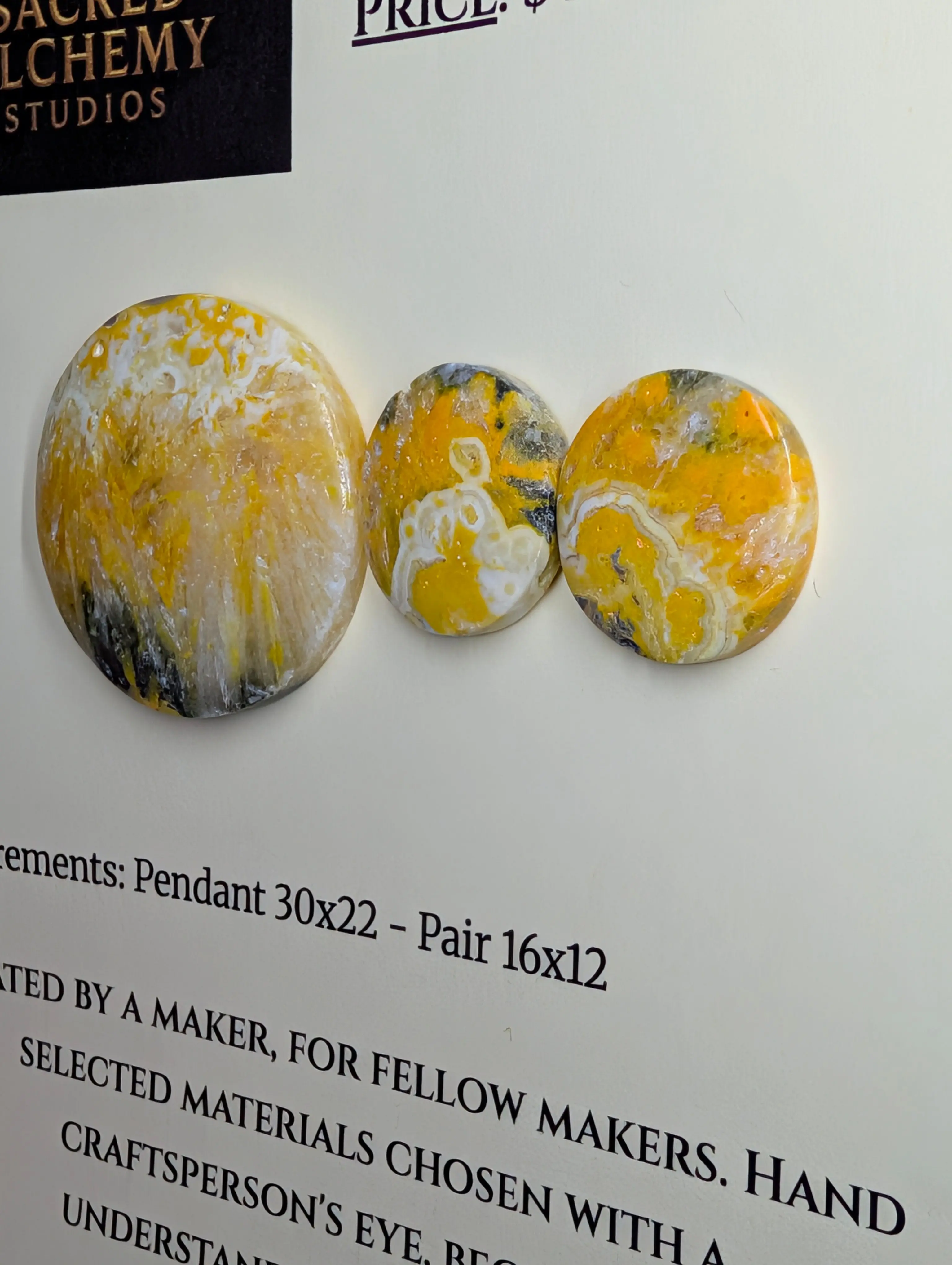 Circle Shape - Bumblebee Jasper - Design-Ready Set brings three circle-cut Bumblebee Jasper stones into one convenient design-ready package. Known for vivid yellows, inky blacks, and the volcanic origins that give each piece its unique texture, this set delivers a bold, energetic aesthetic that's ready to elevate your next jewelry project.
