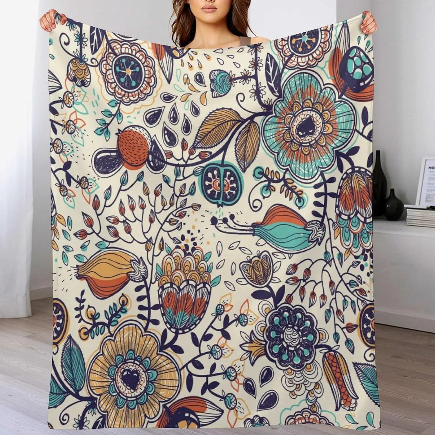 Retro Flowers Flannel Throw Blanket Bohemian Art Abstract Flower Fruit Pattern Pattern Soft Blankets for Home Couch Bed Sofa Chair Travel Decor for All Seasons, 50"x70"