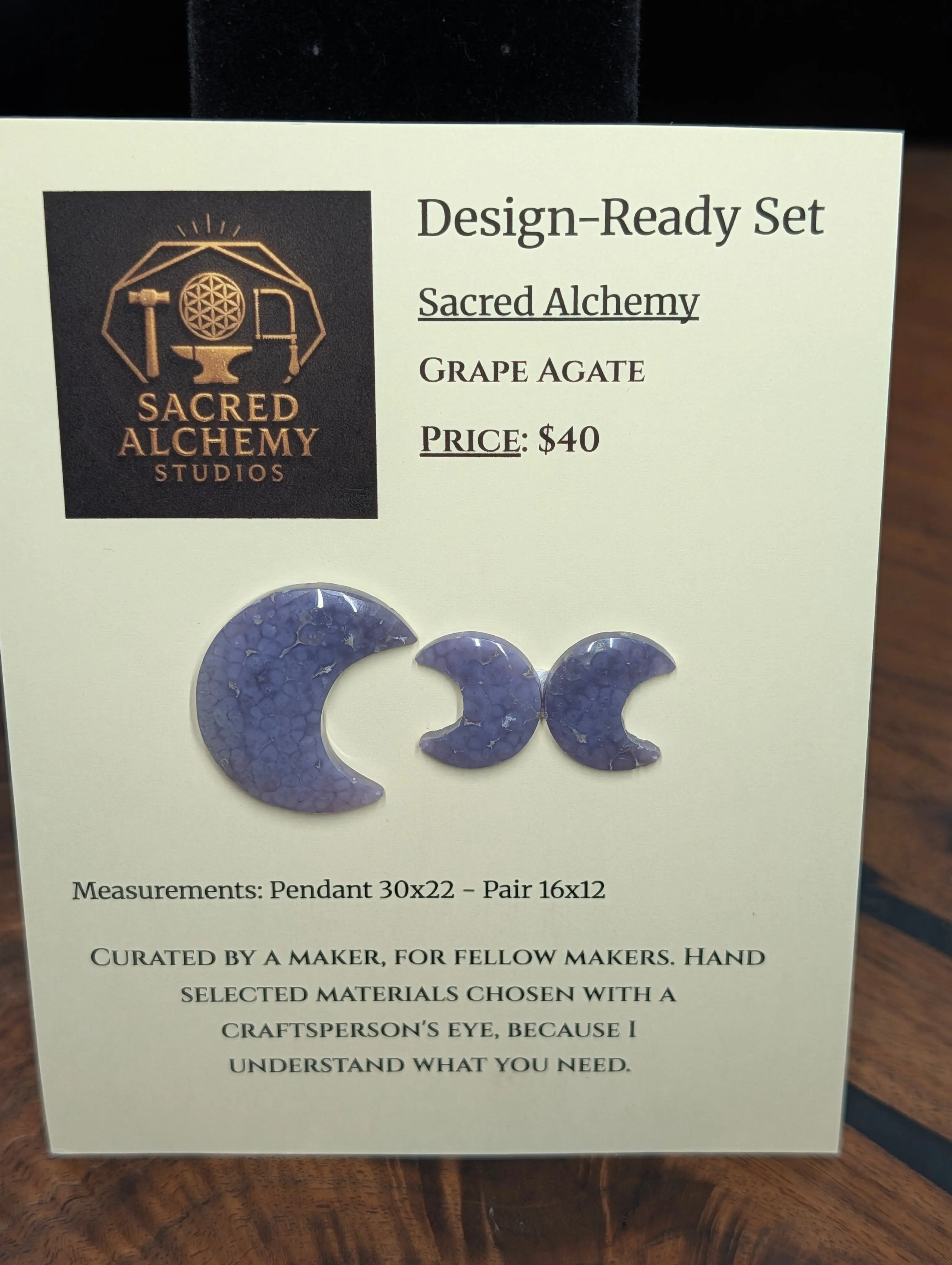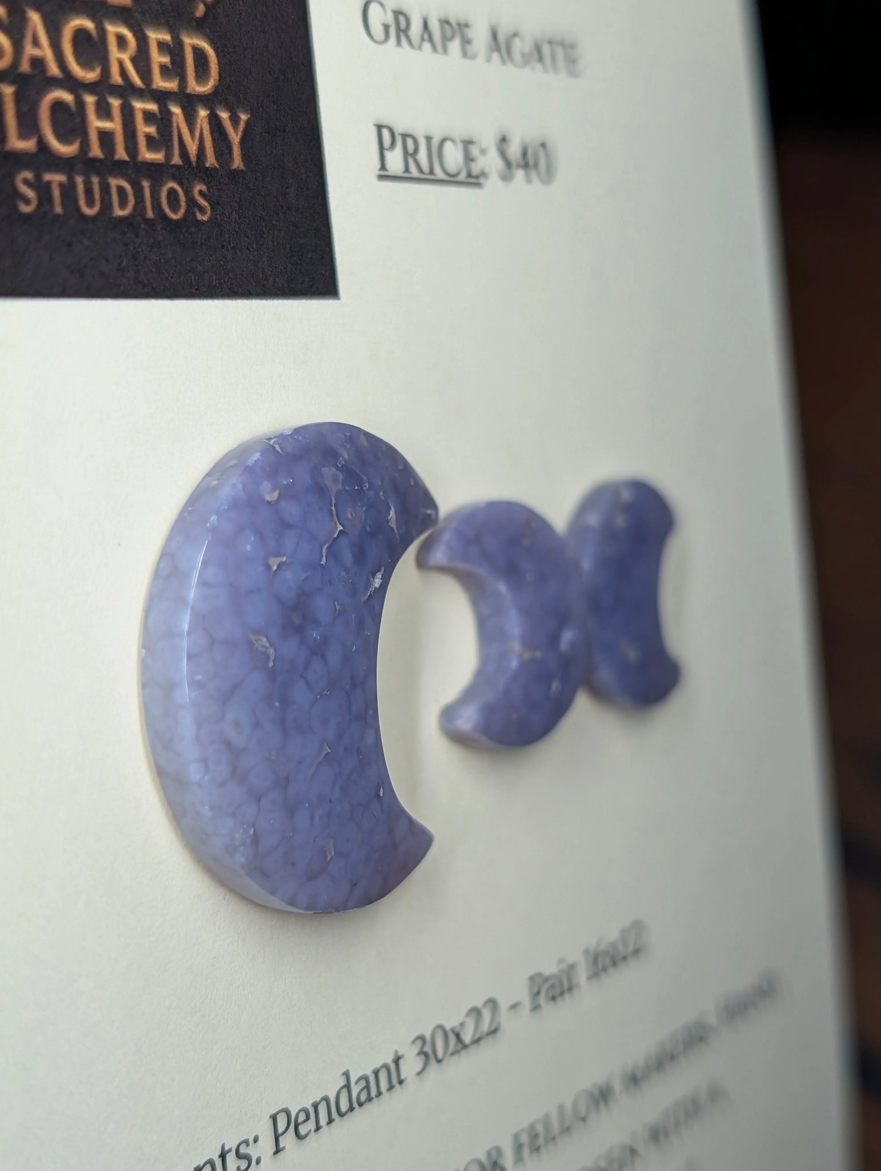 Practical details: Stone Type: Grape Agate; Cut/Shape: Crescent Moon; Set Configuration: One pendant stone and two matching earring stones; Design Ready Set—same shape and stone for a streamlined design process; Quality Grade: Premium selection from our highest-quality monthly arrivals; Pricing: $40.00. Design tips: Pair these crescent moons with silver, gold, or rose-tone metals to highlight the purple hues, or mix with complementary stones like rose quartz or clear quartz for contrast. For a multi-piece collection, start here to ensure color and form consistency across the line.