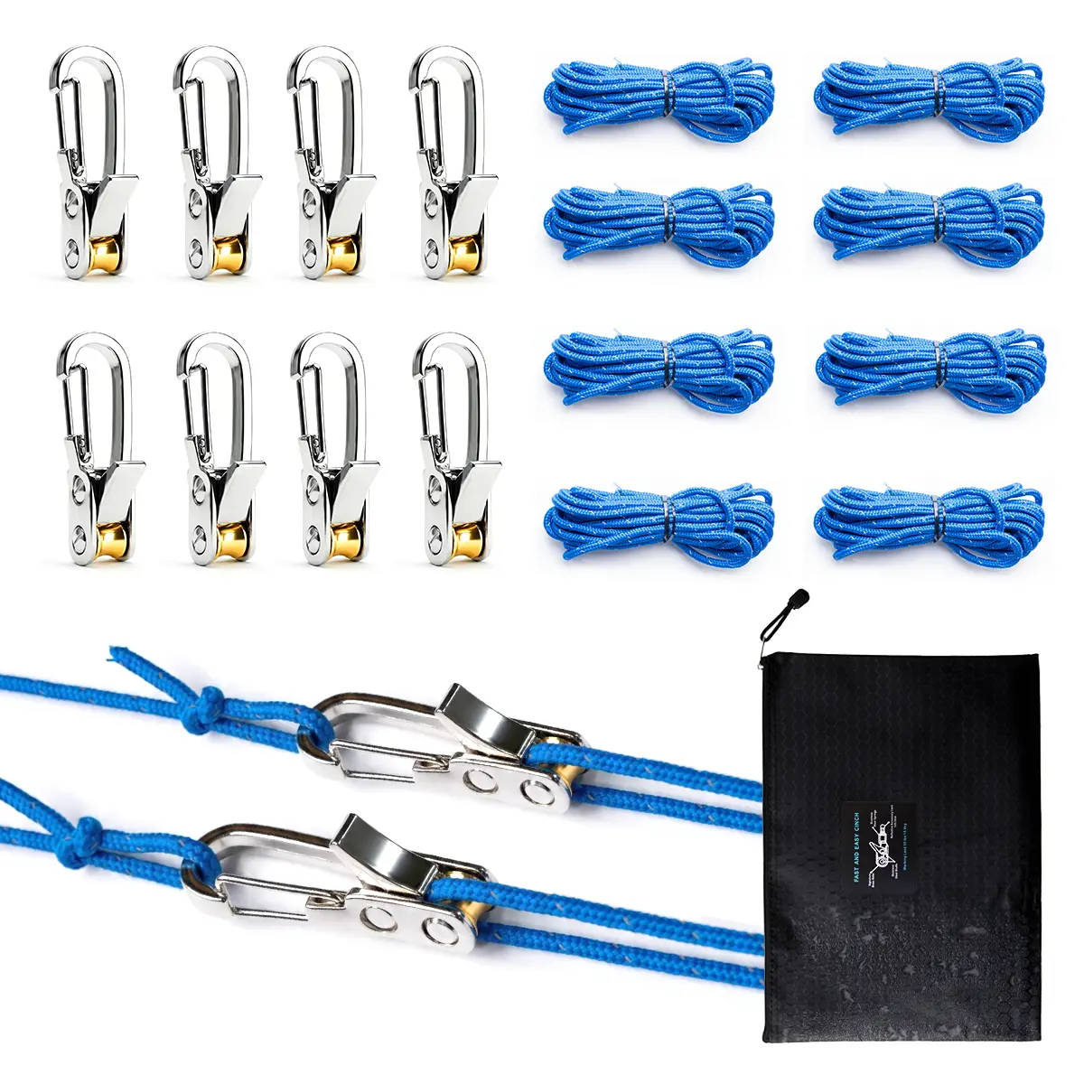• COMPLETE 8-PACK KIT: Includes 8 heavy-duty metal rope tensioners, 8 reflective blue cords for enhanced visibility in low light conditions, and a convenient carry case for organized storage and portability