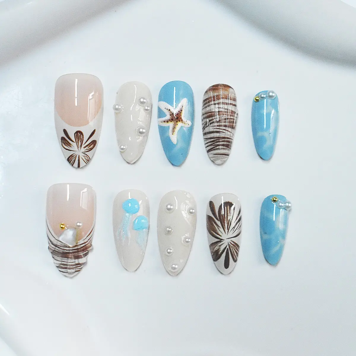 10 Pcs 3D Ocean Shell Starfish Almond Nails, Blue Wave Pattern with Natural Pearl Accents, Glossy Fake Nails for All Women, Party, Vacation, Daily Wear
