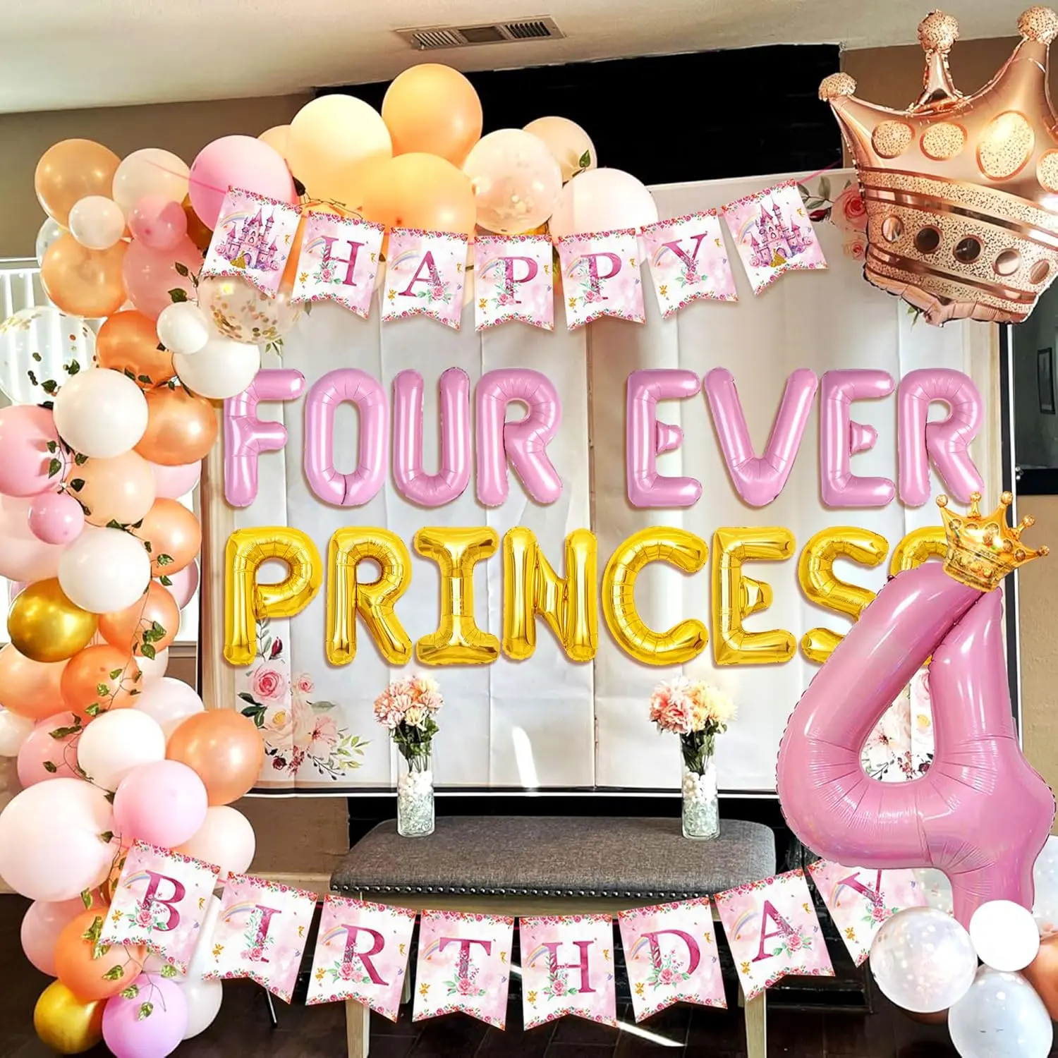 4th Birthday Princess Balloon: Princess birthday party decorations include 1X large 30 inch number 4 balloon, 1X16 inch “Four Ever a Princess” alphabet balloon, 6 Xpink balloons, 4X white balloons, 4 Xgold foil balloons, 4X gold balloons, 1X Happy Birthday Princess banner, 50 total.