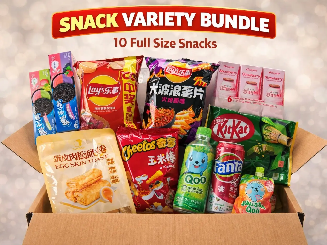 Enjoy a fun and exciting mix of 10 full-size Asian snacks in one box! This bundle includes a variety of sweet & savory treats like chips, cookies, chocolate, and drinks. Perfect for trying new flavors without leaving home. Each box is randomly curated, so every order is a fun surprise!!