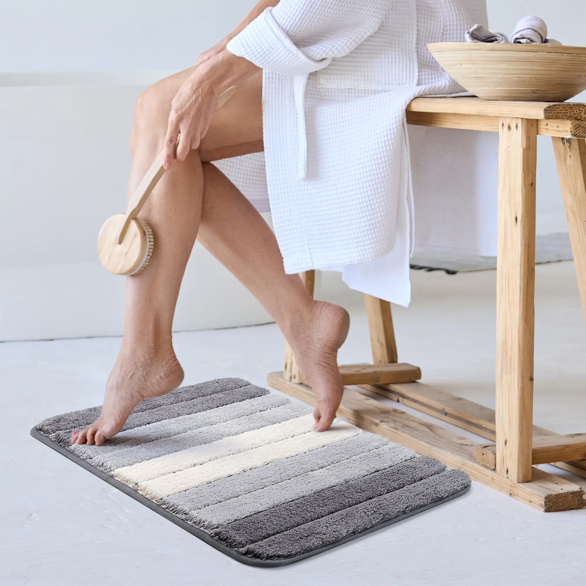 The surface of our bathroom rug is made form microfiber which is quite comfortable to stand on.