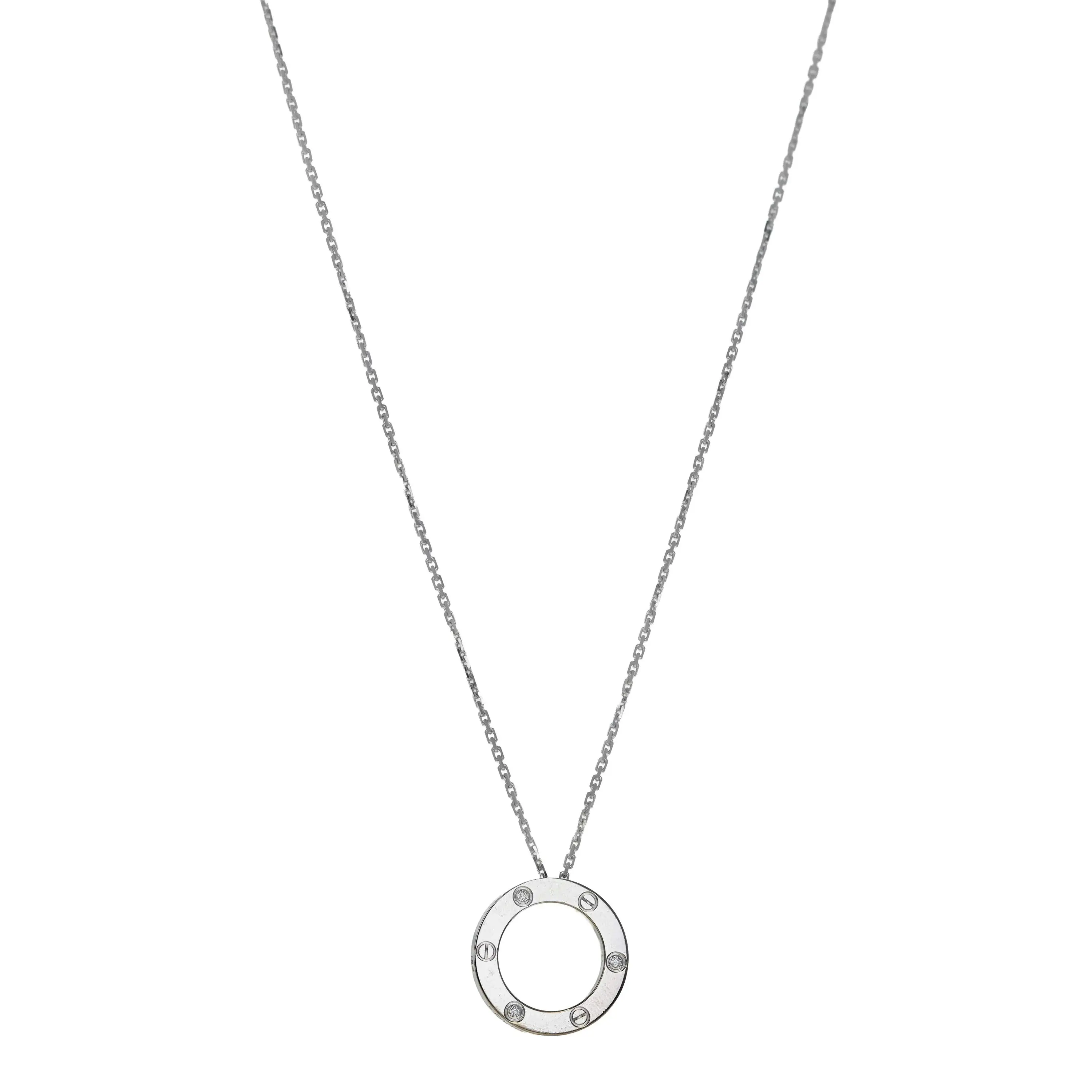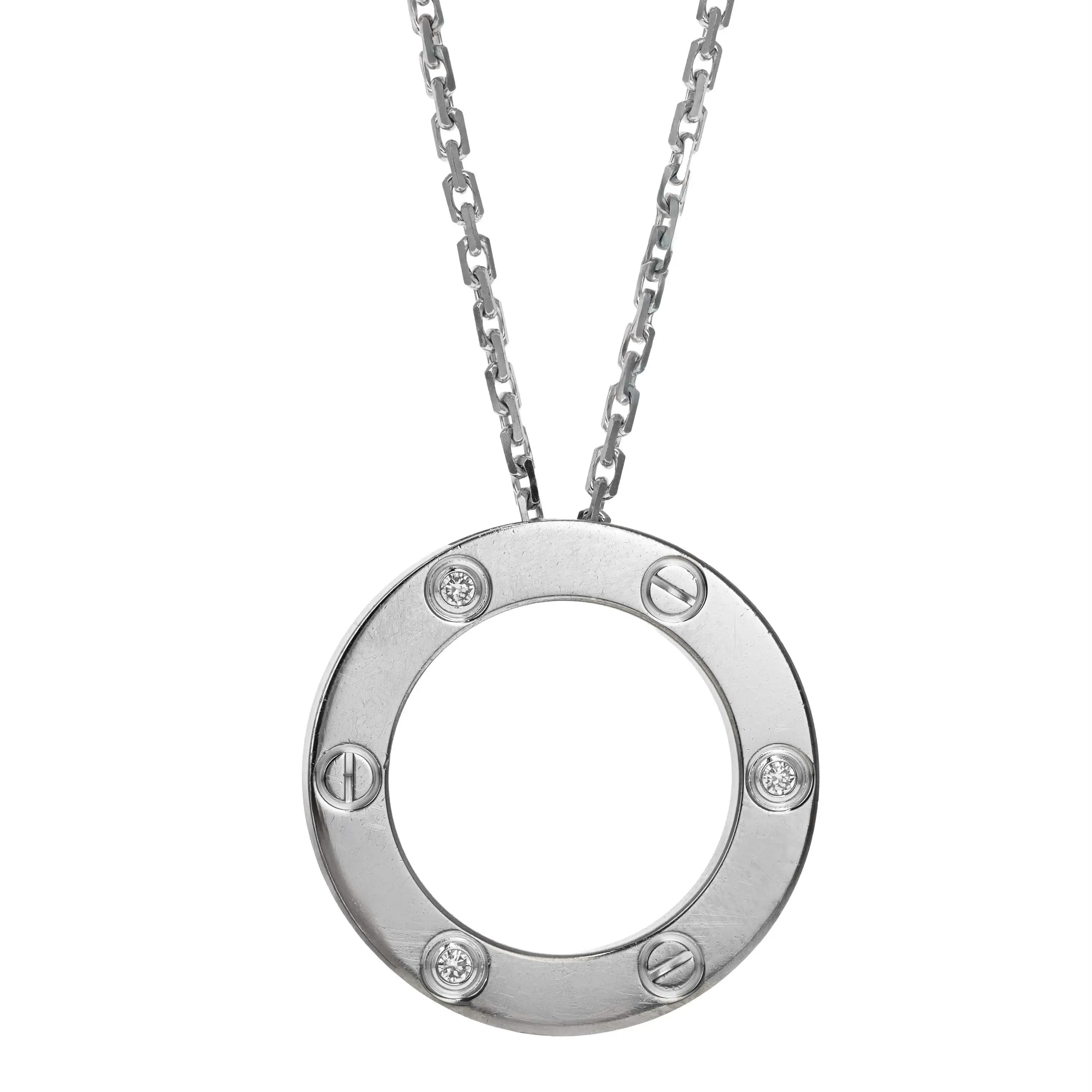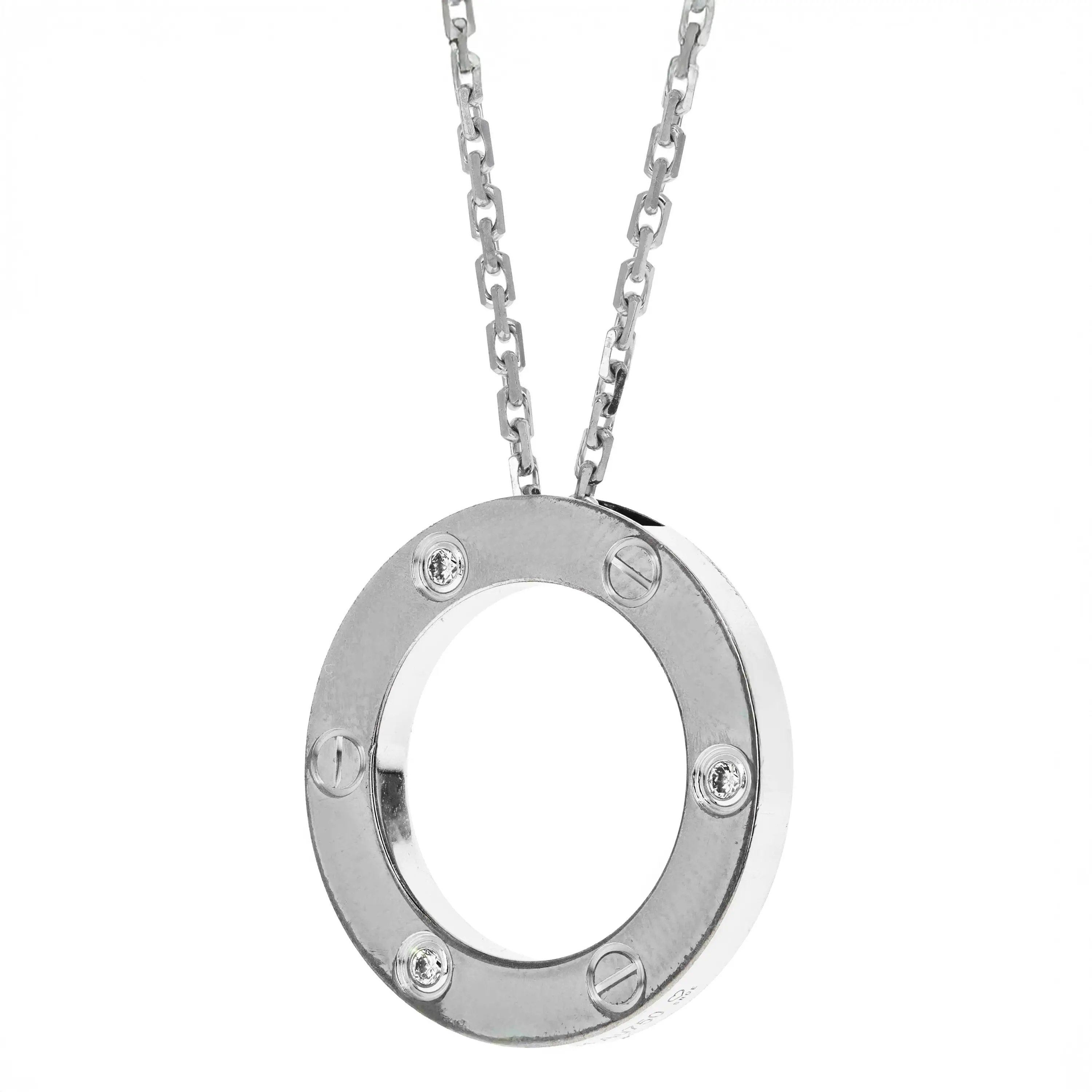 Pre-owned Cartier 18kt white gold and diamond pendant necklace from the Love collection. The necklace features an open-circle pendant with an alternating signature screw-design and three round brilliant diamonds evenly spaced around the circle. The pendant is sliding on a cable link chain that measures 16.5 inches in length and is secured with a lobster clasp. This piece comes with original Cartier box and papers.