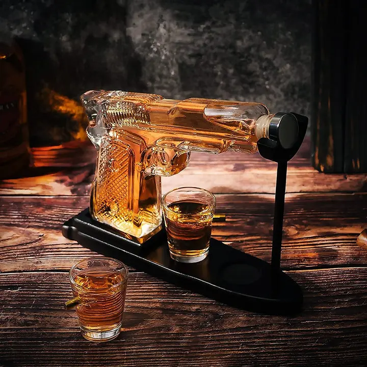 ·Set includes a gun decanter, 2 bullet shot glasses, and a wooden stand