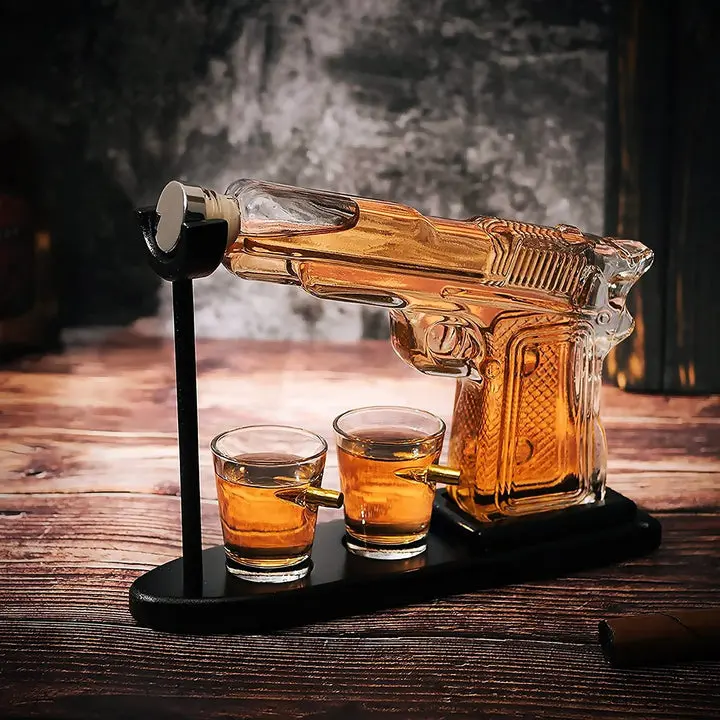 ·Gun decanter and bullet shot glasses are a bold and beautiful display