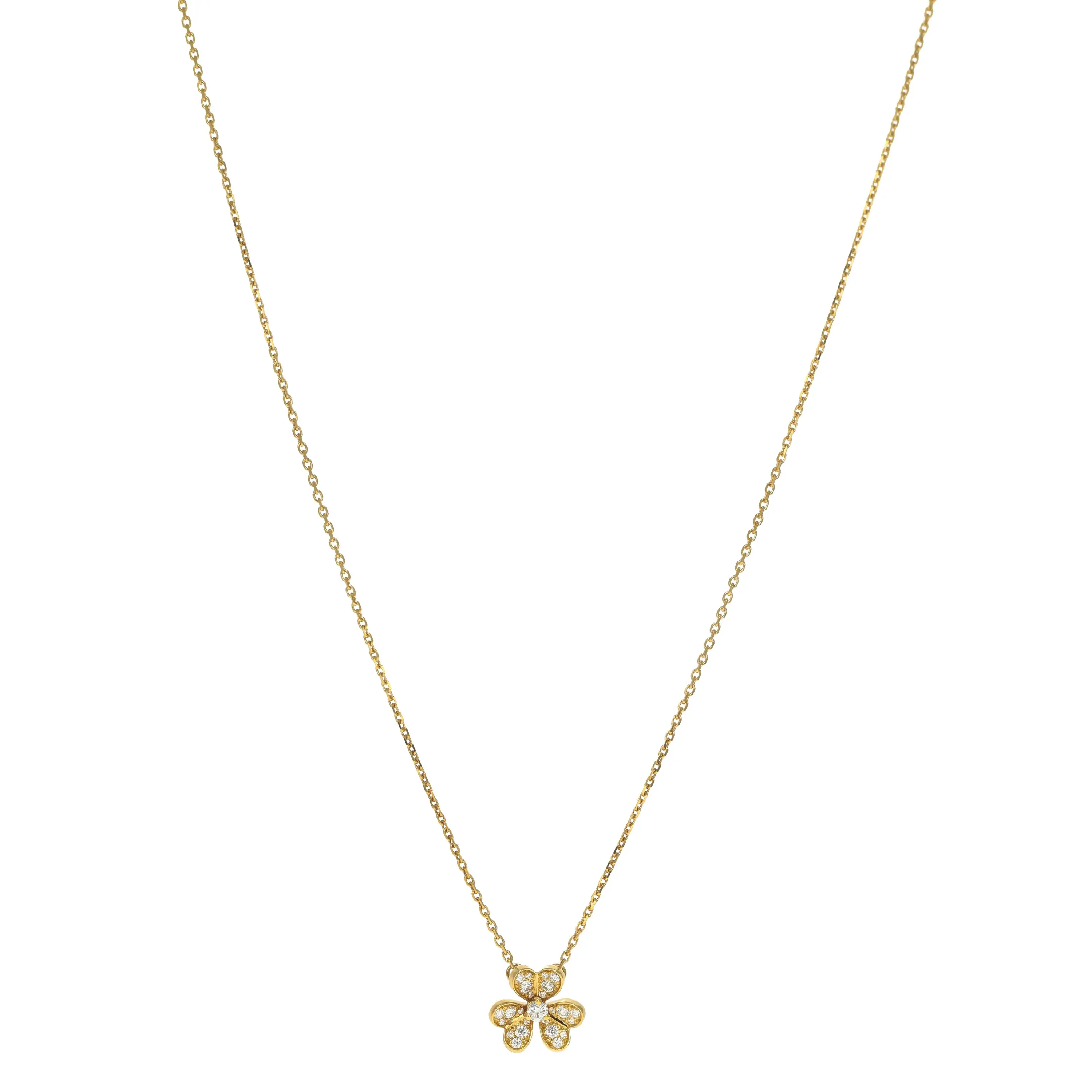 Pre-own Van Cleef & Arpels 18k yellow gold and diamond necklace from the Frivole collection. The necklace features a three petal flower pendant with pave round brilliant diamonds set in the petals as well as a singular round brilliant diamond in the center of the flower. The pendant is fixed on an adjustable cable chain secured with a lobster clasp and is 15 to 15.75 inches in length.