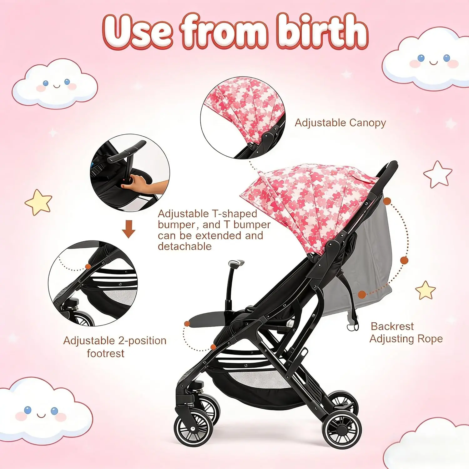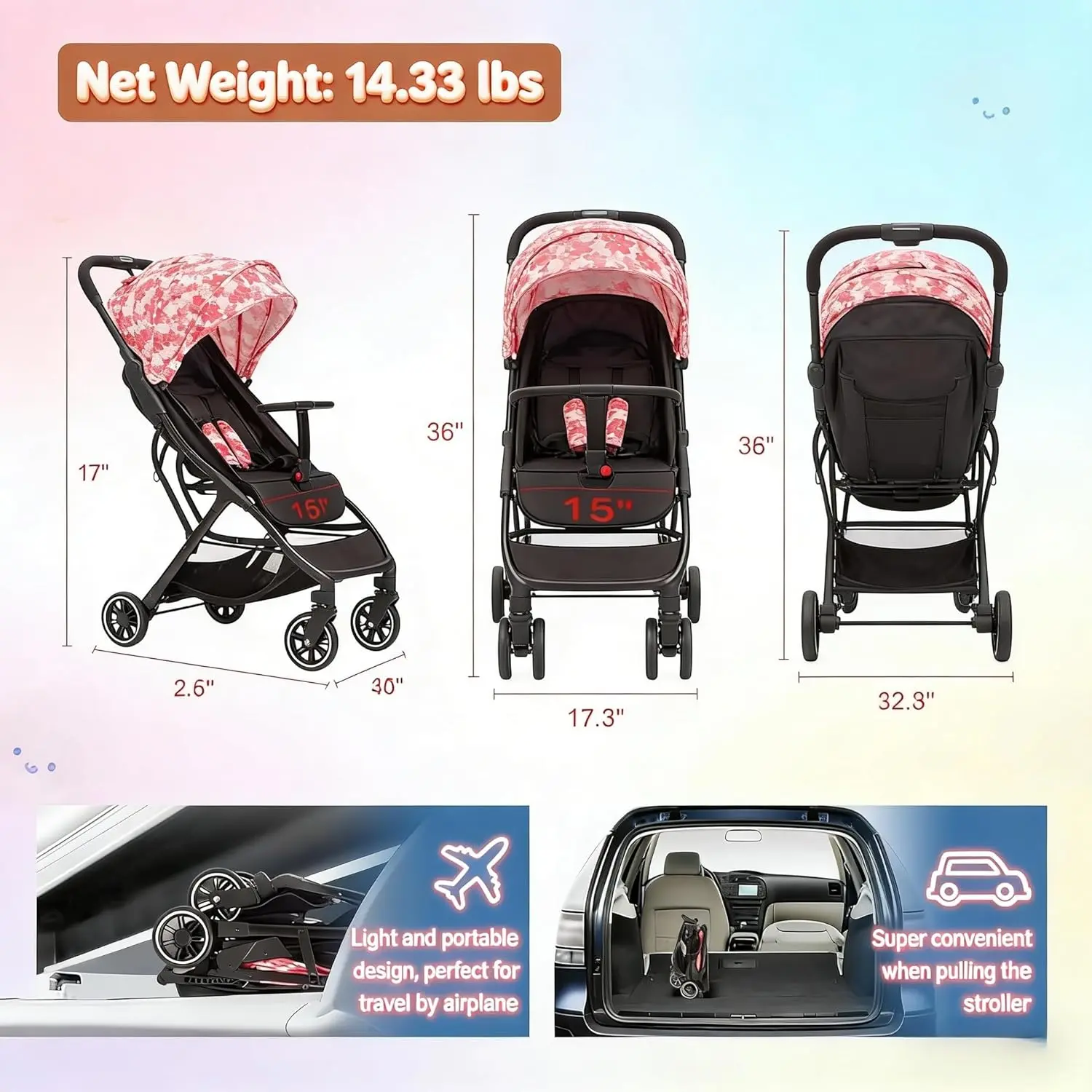Portable Stroller with Automatic Fold,Lightweight Umbrella Stroller with Pop Out Sun Canopy,Compact for Travel(Pink)