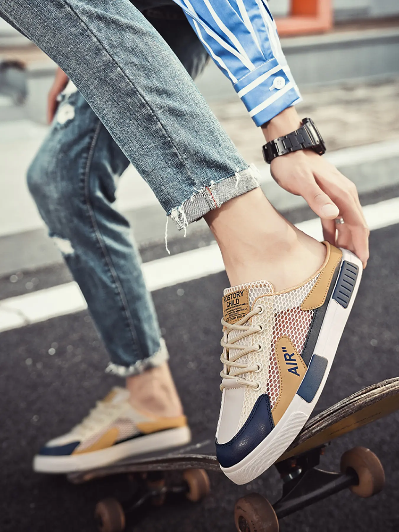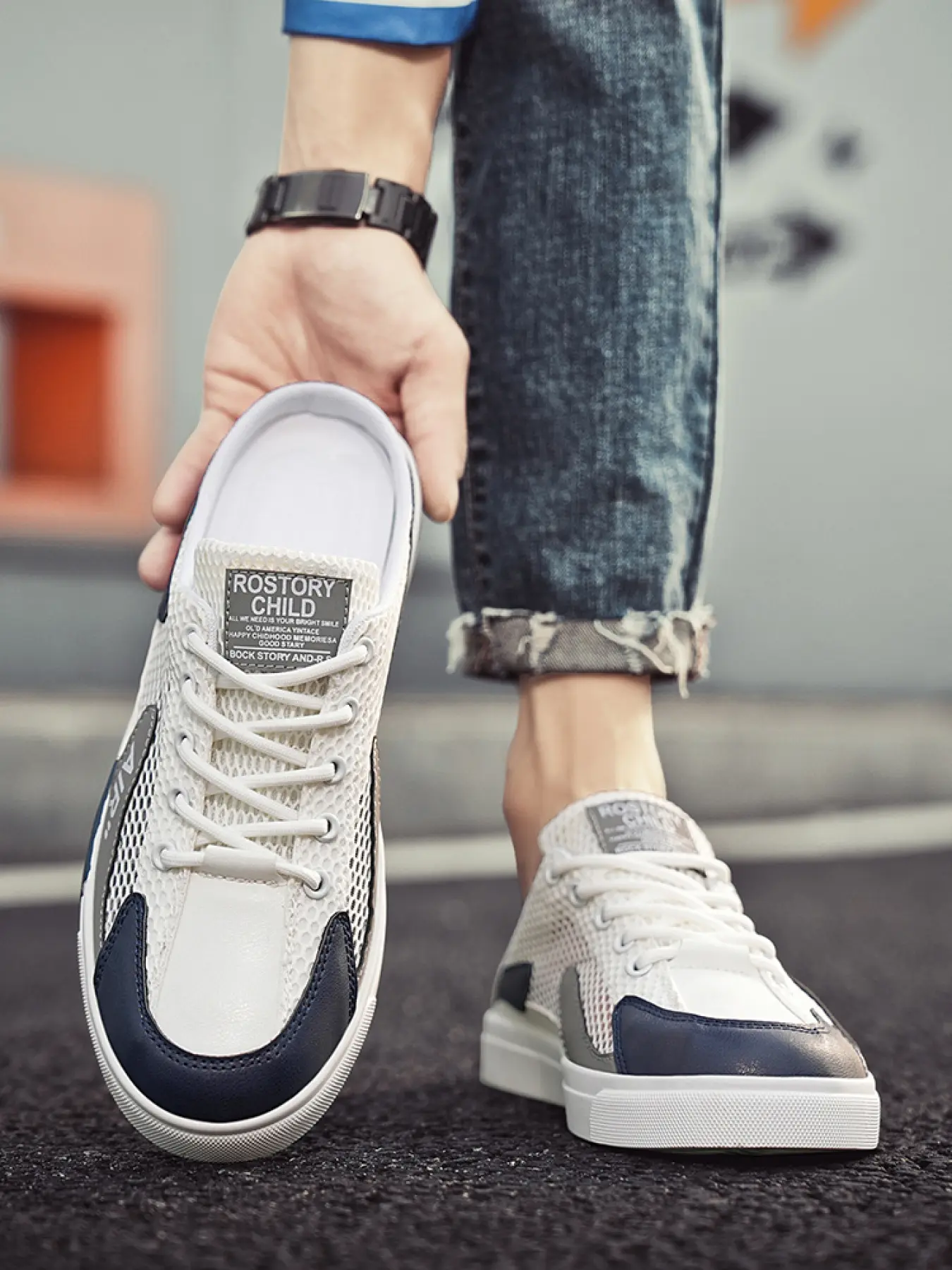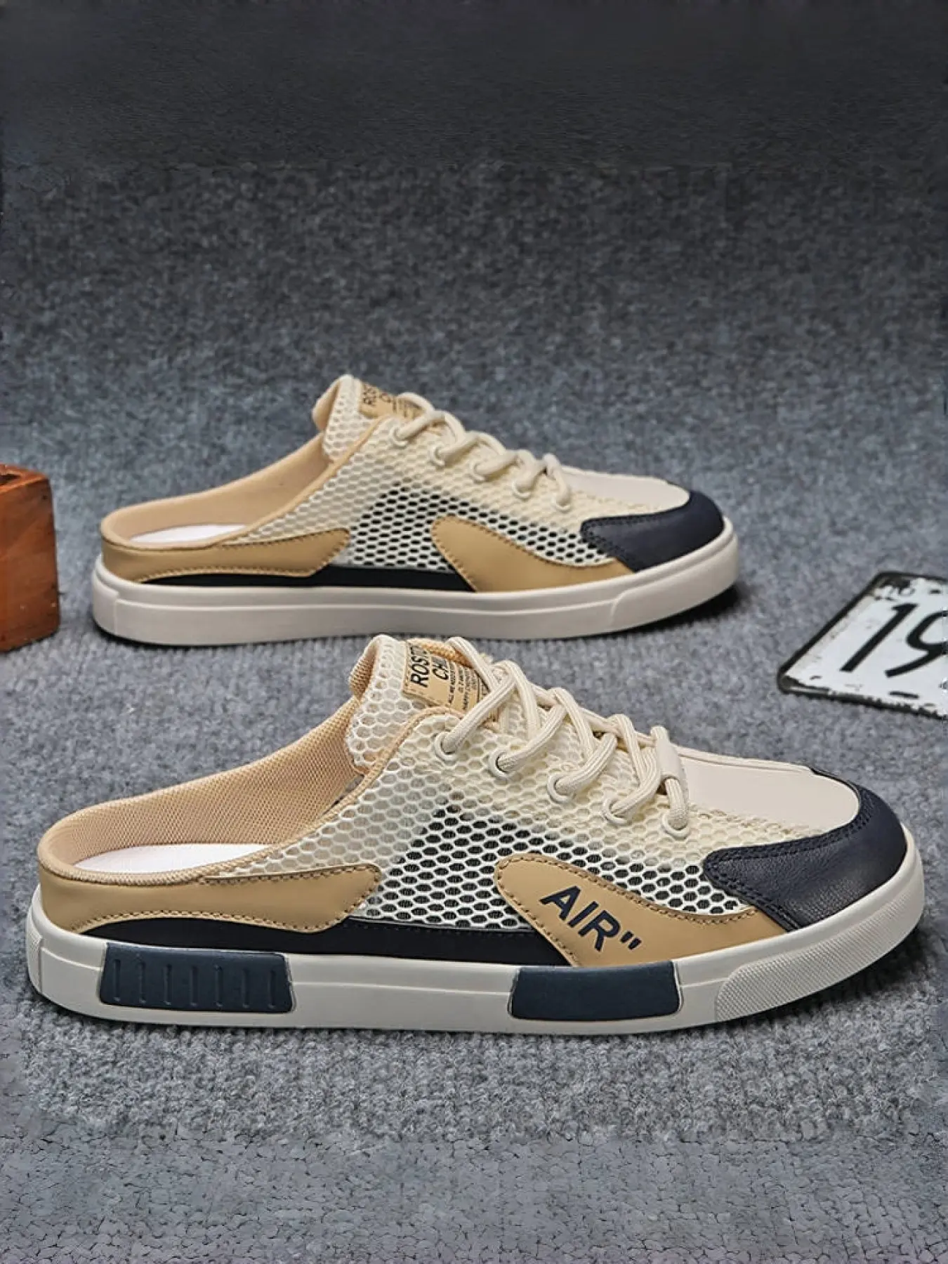 5. 1 Pair Men's Large Size Trendy Color-Block Mule Slippers, Breathable Hollow Mesh Fabric, Anti-Slip Texture, Convenient Laces, Slip-On Casual Shoes for Students