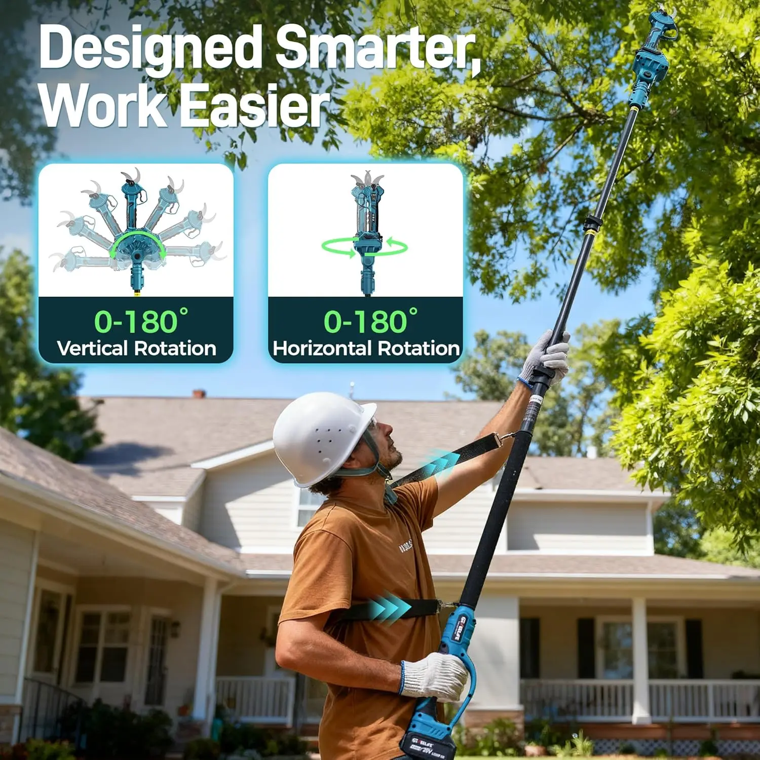 ·【User-friendly Design】Weighing only 2.1 lbs, this pruner features a non-slip rubber handle and ergonomic shoulder strap, reducing hand and arm fatigue during extended use. The 180° adjustable rotating head enhances cutting efficiency, offering flexibility for various cutting angles. The blade is equipped with a protective cover to prevent damage and ensure safe storage.