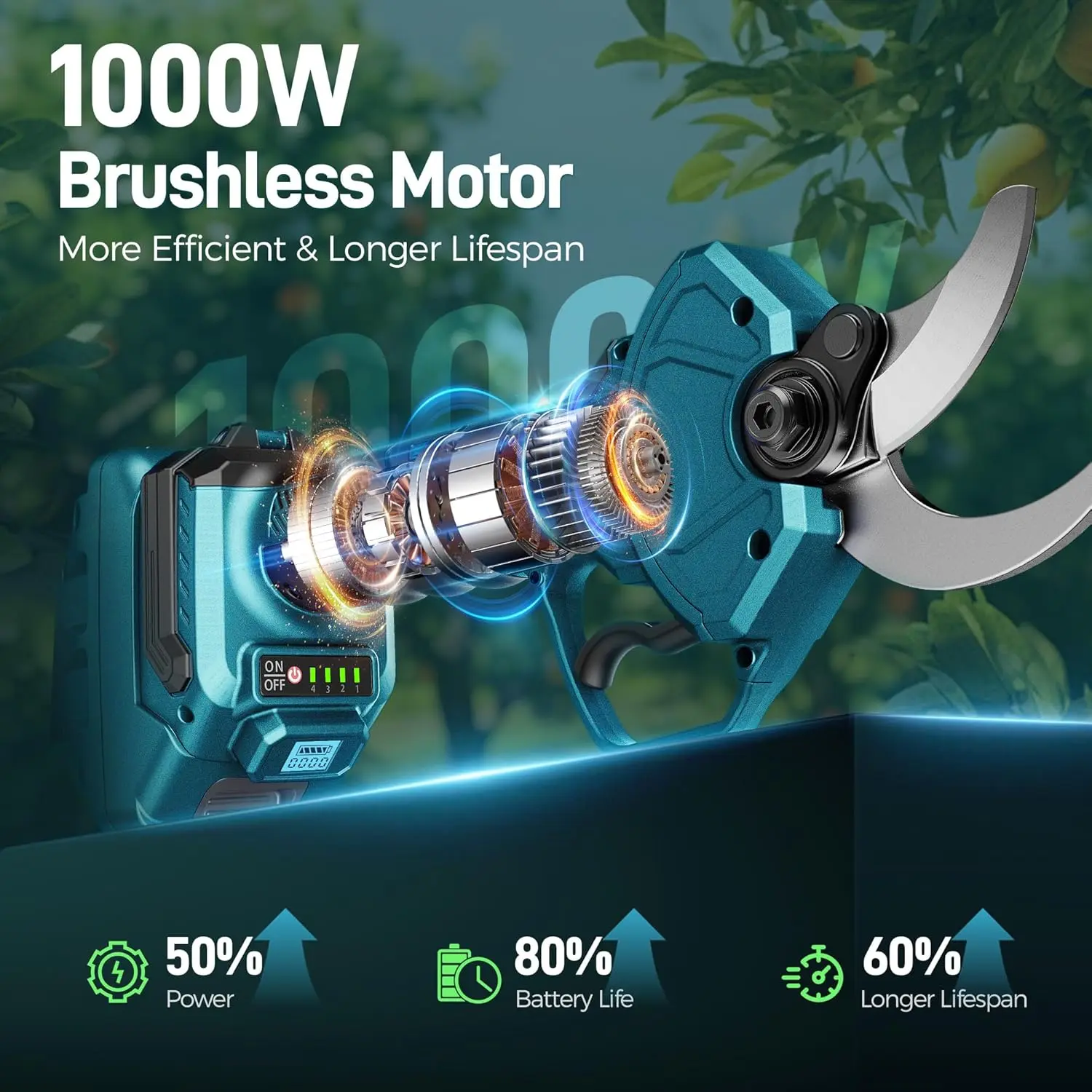 ·【Fast Cutting & Precise Pruning】Powered by a 1000W pure copper brushless motor for strong performance and long-lasting durability. SK5 high-carbon steel blades offer sharpness, rust resistance, and long-term use. Cut branches in just 0.5s with smooth, clean cuts to minimize plant damage. The ideal choice for effortless gardening pruning.