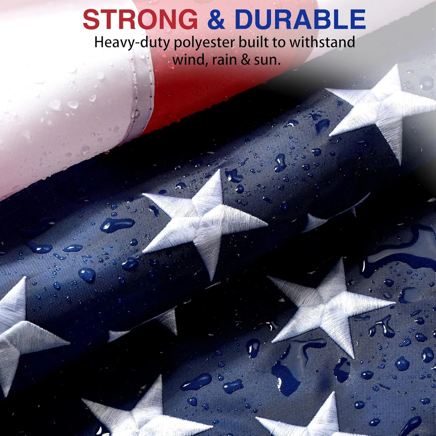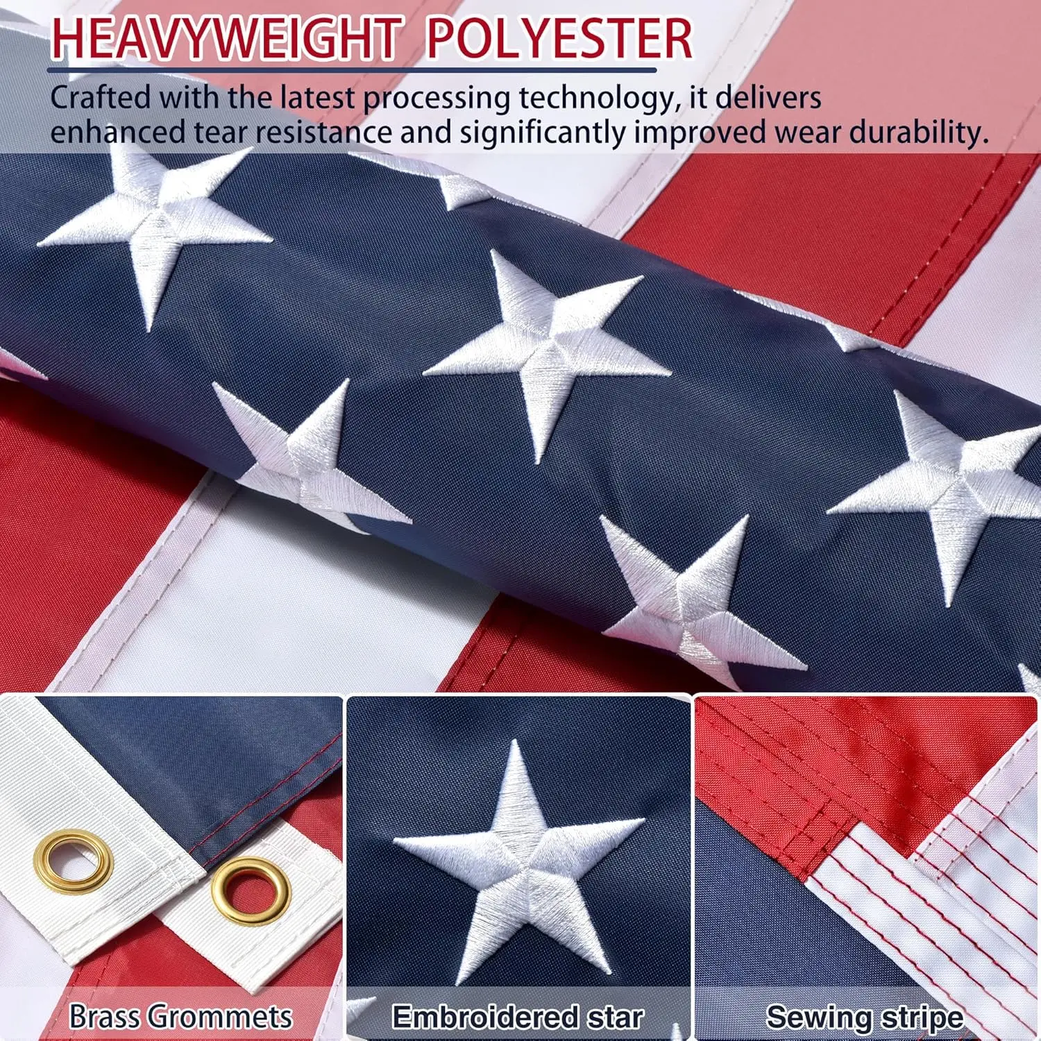 Each star is individually embroidered with double-stitched precision for a polished look. The flag's edges are reinforced with four rows of stitching and double-lock stitching to resist fraying and tearing.