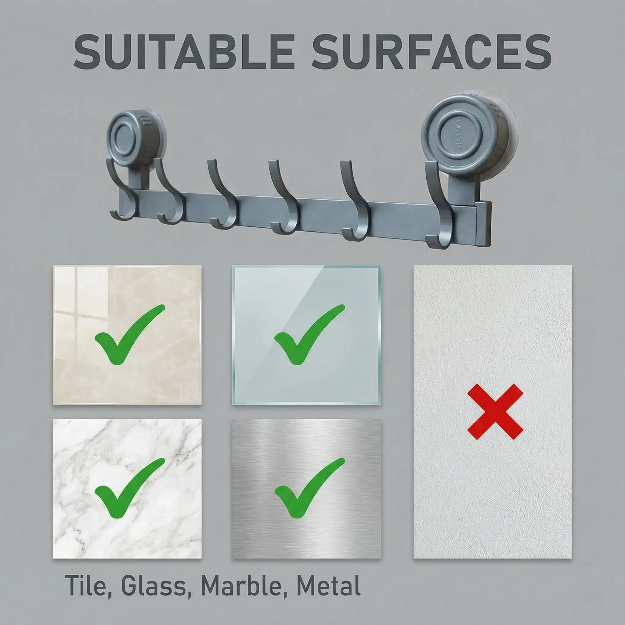 ·Suitable Surfaces: Tile, Glass, Marble, Metal, and other smooth, non-porous surfaces ( Not for painted, textured, or porous walls)