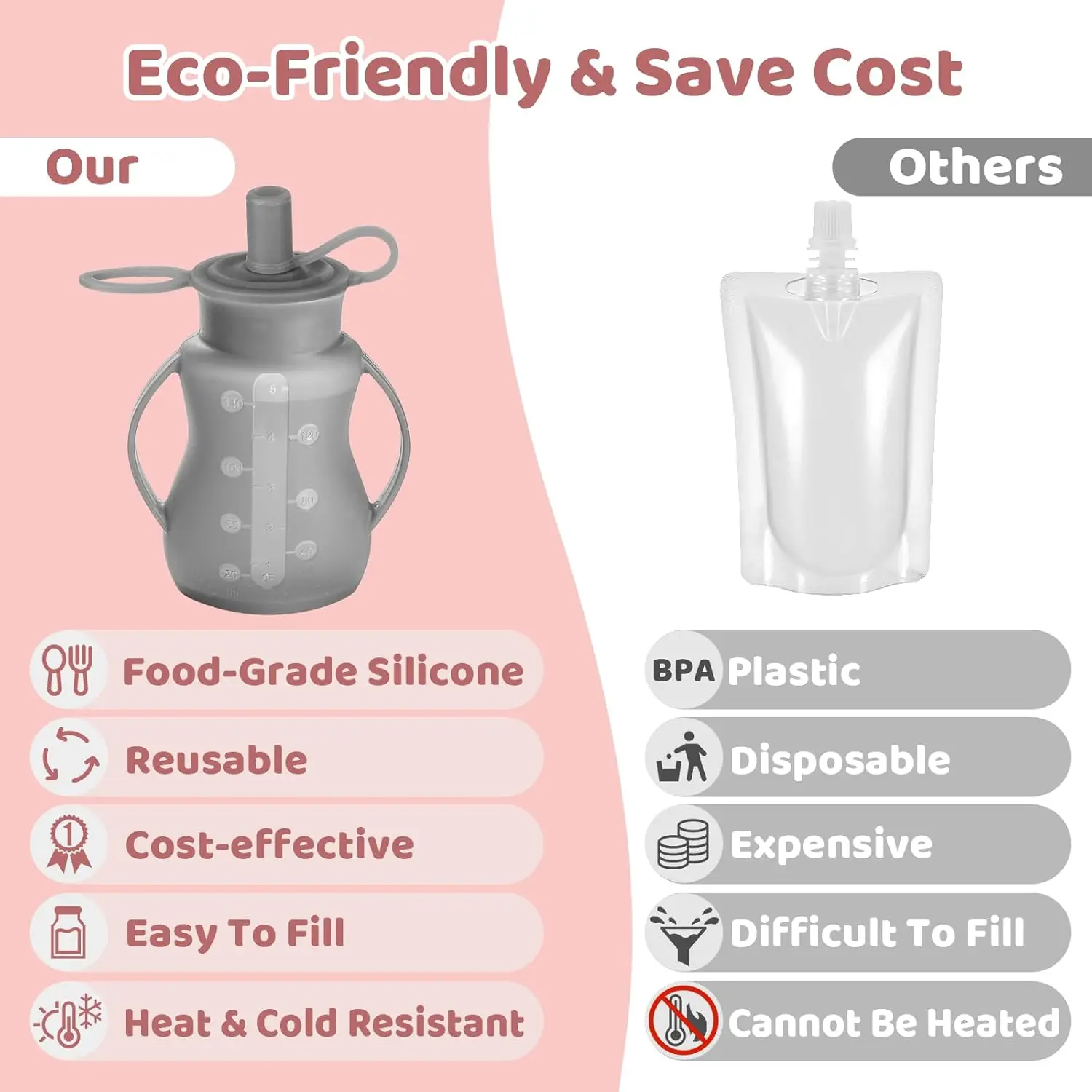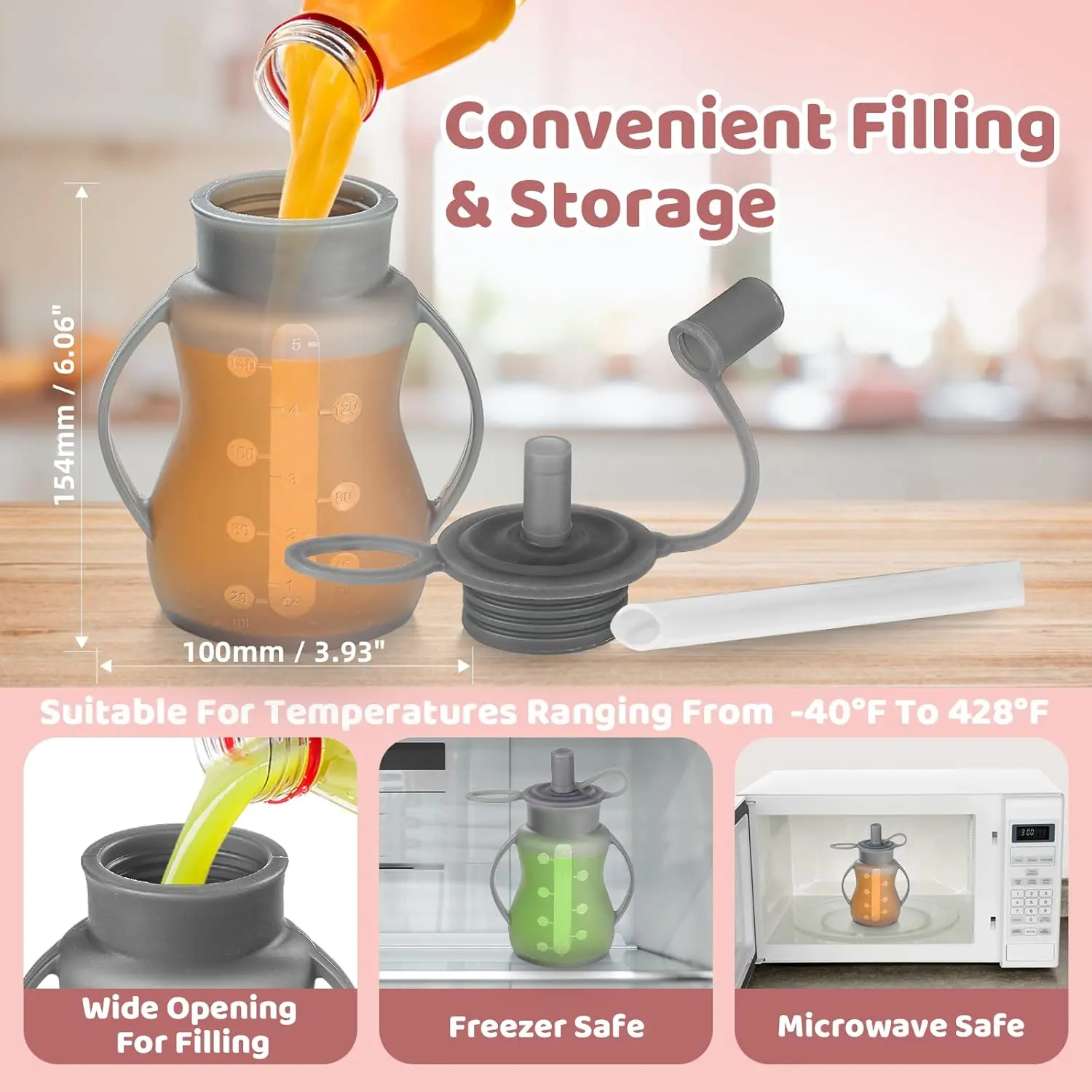 Reusable Baby Food Pouches with Straws for Toddlers, 2 Pack Silicone Baby Food Squeeze Pouches Refillable for Kids,Leakproof, Dishwasher & Freezer Safe, Perfect for Homemade Puree (Grey)