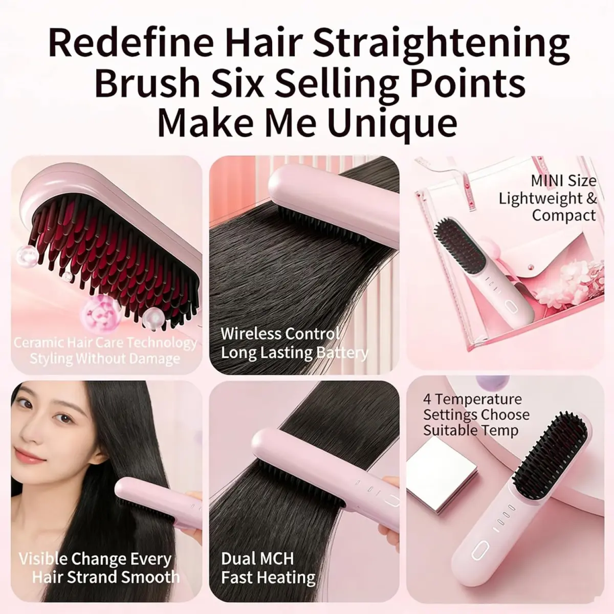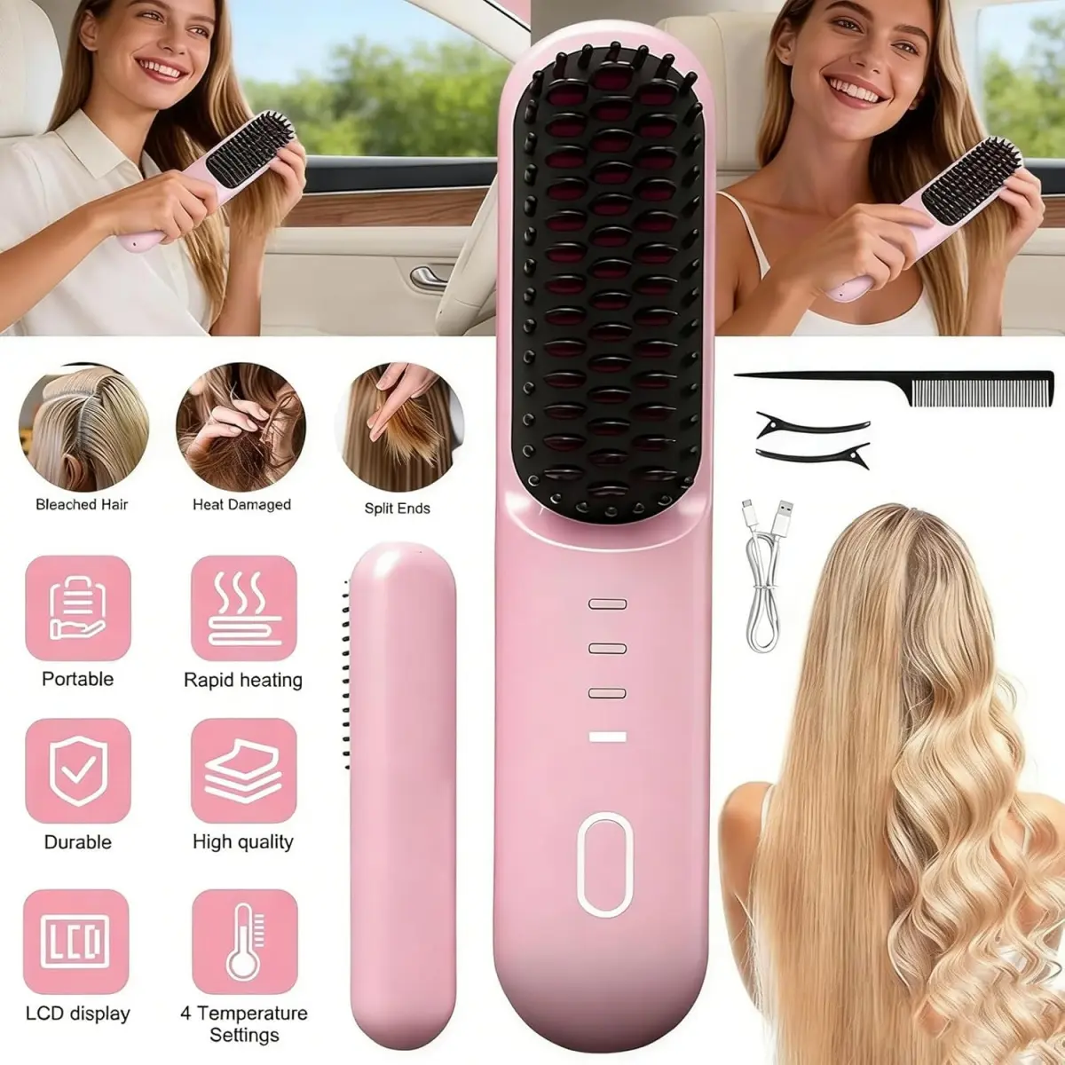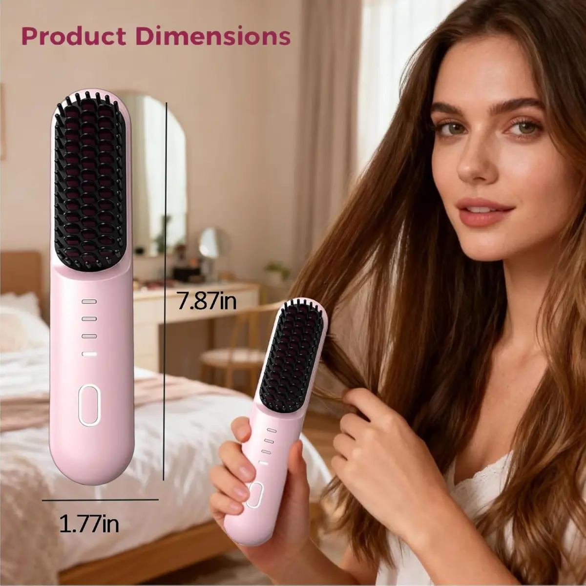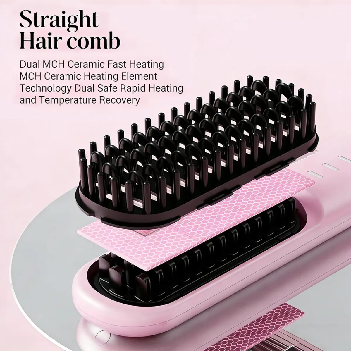 Divide the hair evenly, grasp a section firmly, and insert it into the comb teeth 1–3 cm from the roots.Smoothly pull downward.Repeat this inward-pulling motion until the desired straightening effect is achieved.