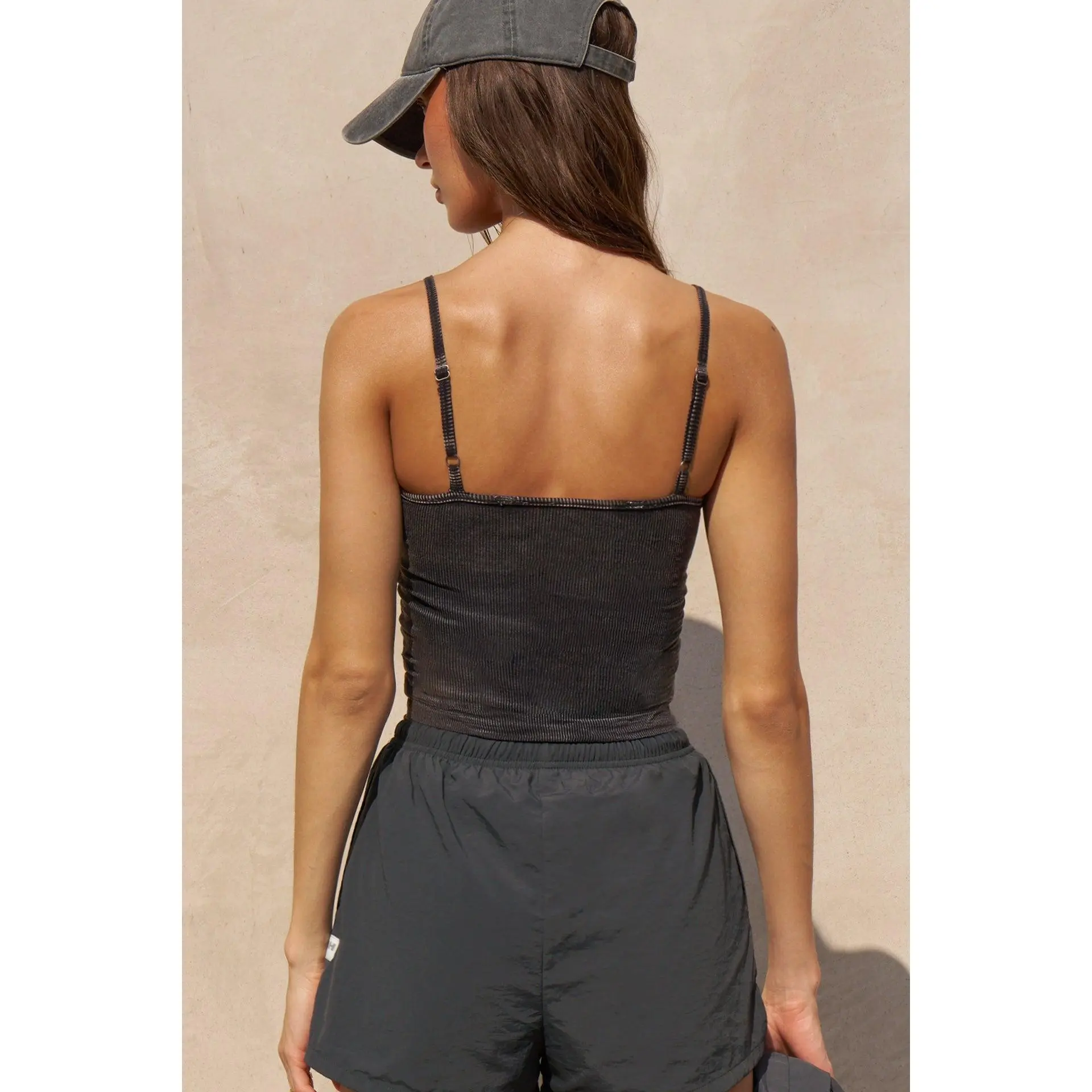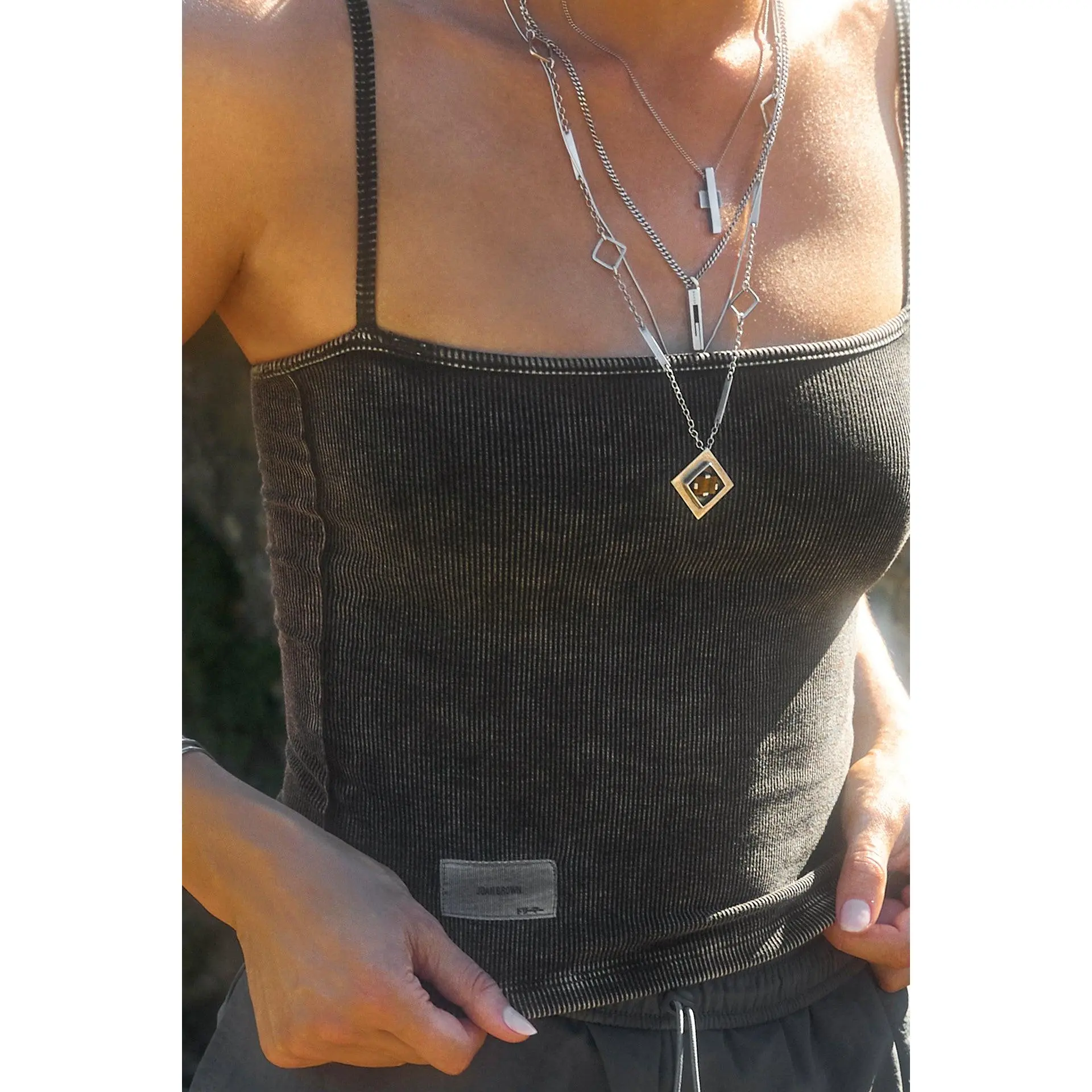 Full-length square neck cami with thin, wide-set straps and a clean, straight neckline.