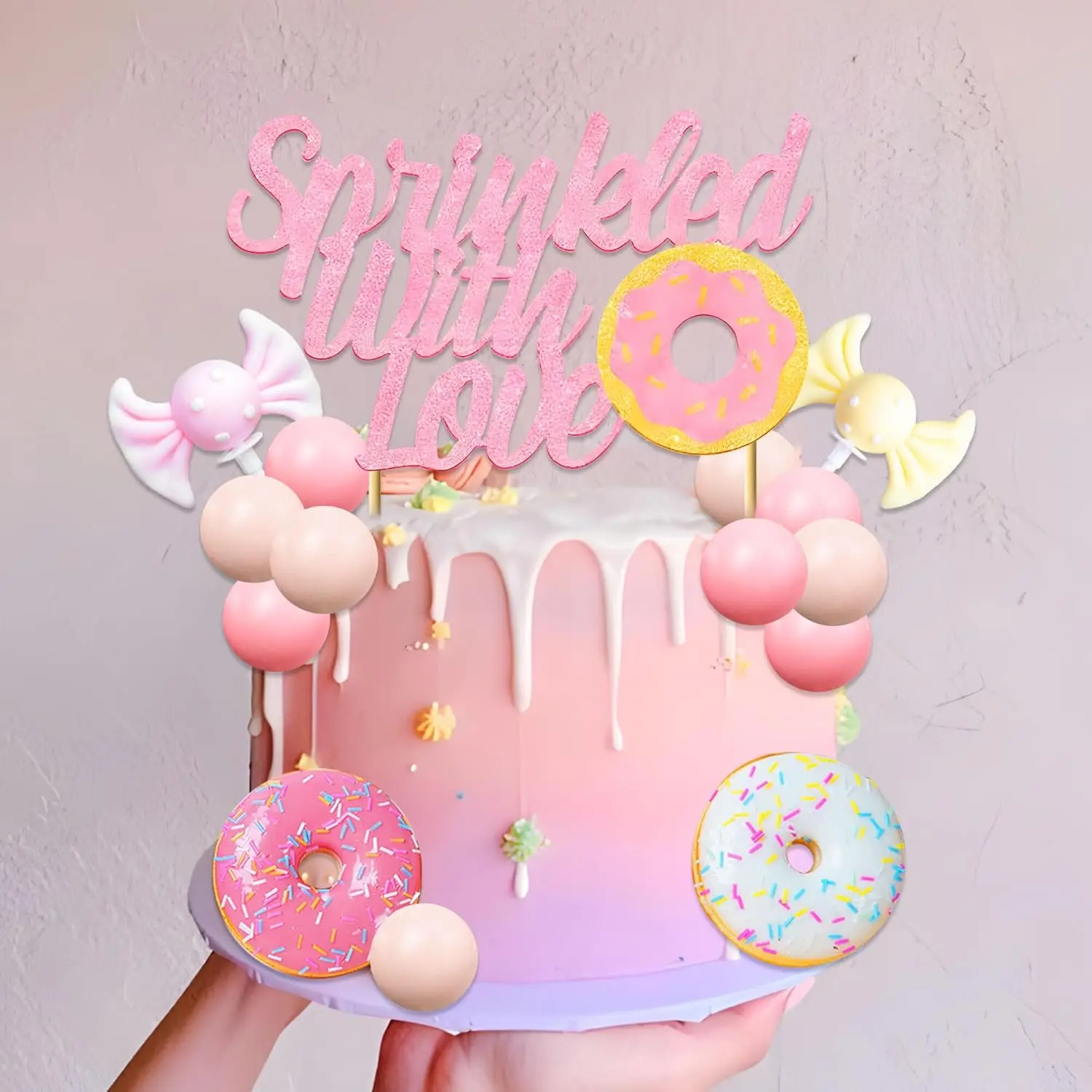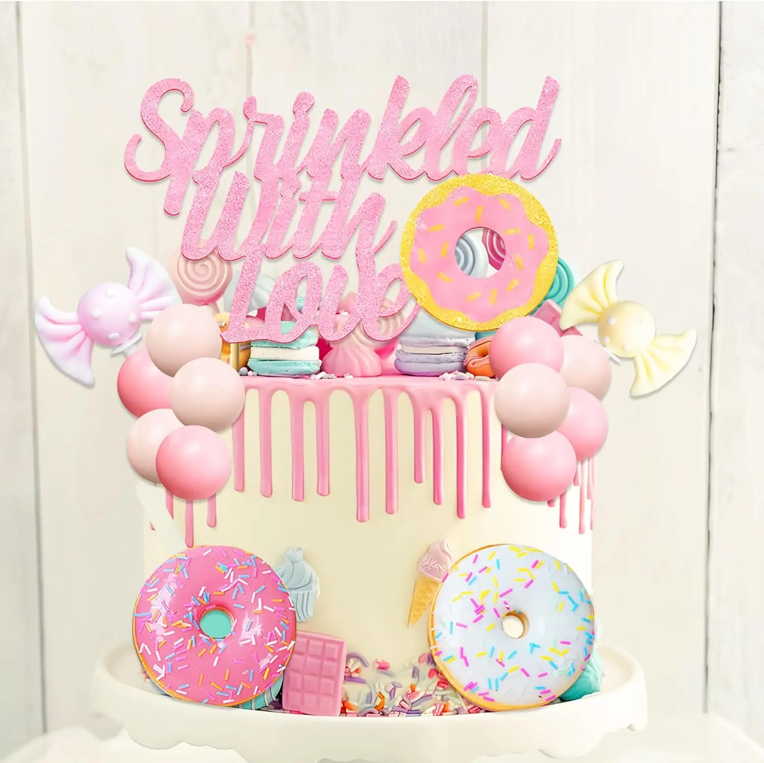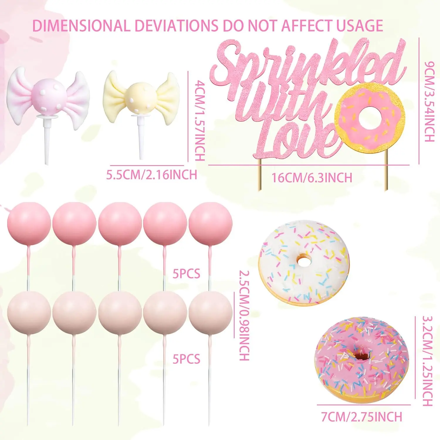 Candy Cake Topper: 2X candy birthday cake toppers, 2 Xdonut cake toppers, 1 Xsprinkled with love cake topper, 5X pink cake balls, 5 Xkhaki cake balls, (as shown in the size chart). These adorable ice cream cake toppers add vibrant colour and beauty to the dessert table, as well as quickly grabbing children's attention, making them perfect for creating memorable moments.