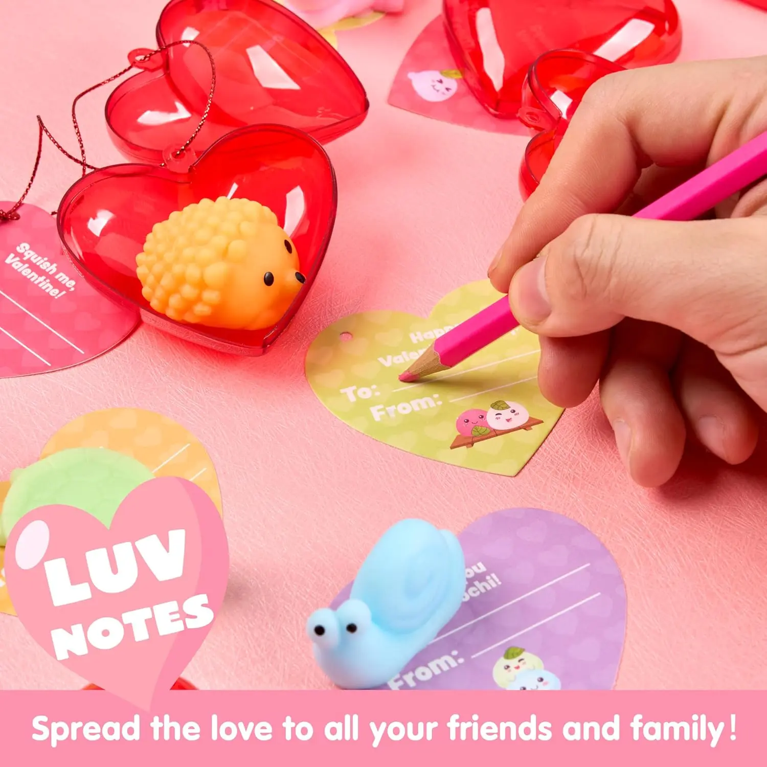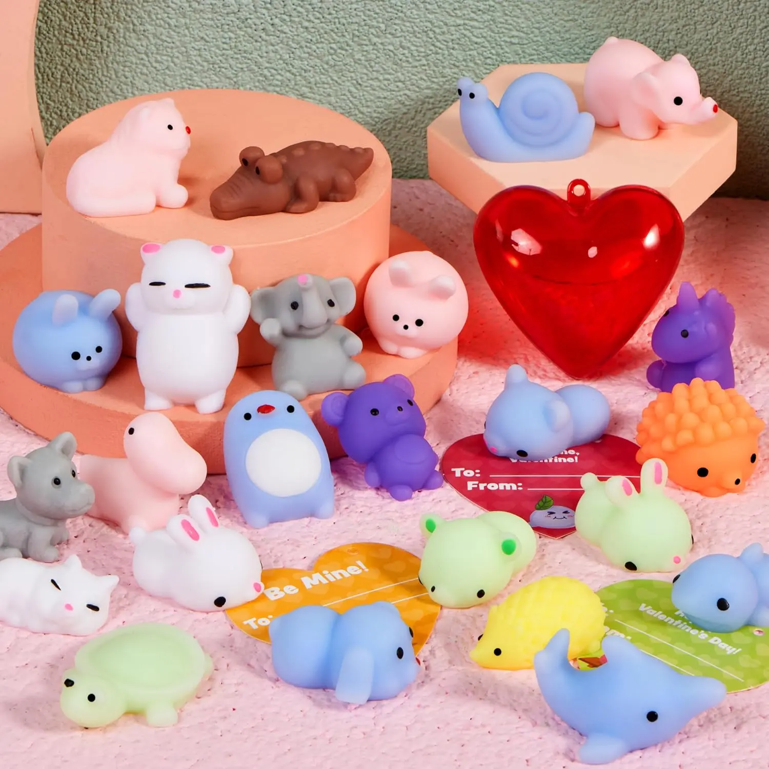 28 PCS Valentine’s Day Mochi Squishy Toys Filled Hearts and Gift Cards for Kids Valentine Classroom Exchange Party Favors, Kawaii Stress Relief Toys for School Game Prizes and Carnivals Gift