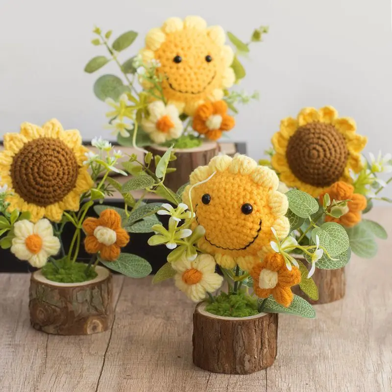 Finished Hand-Woven Potted Plant Yarn Crochet Sunflower Bouquet Handmade Gift Home Decor Knitted Artificial Flower