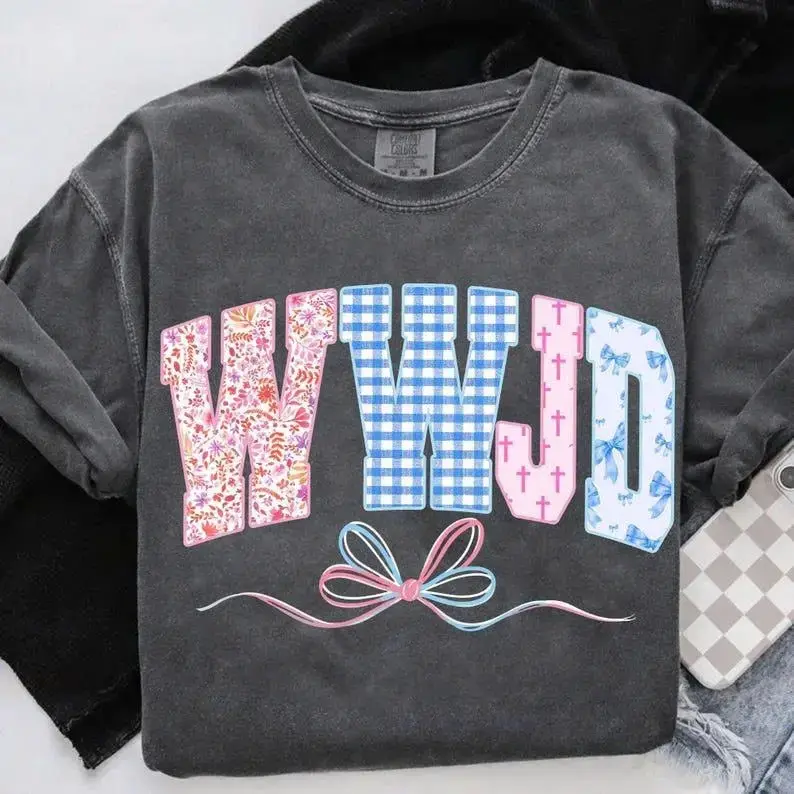 WWJD Christian Pastel Floral Faith Graphic Comfort Colors Tee Coquette Bow Bible Verse Jesus Inspired Shirt