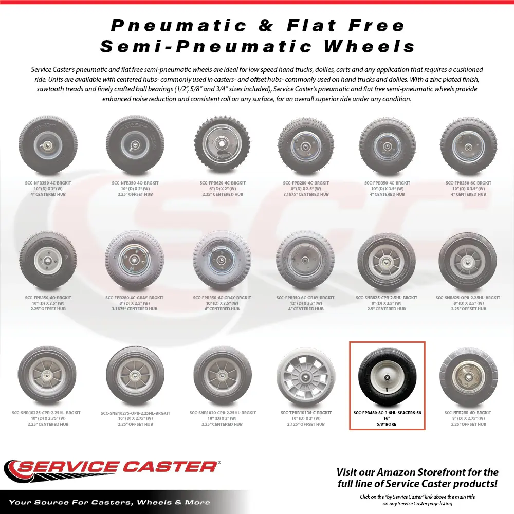 Listing is for one ( 1) Service Caster Air Filled Pneumatic Hand Truck Dolly Wheel with a 16" diameter, 4" tread width and a 3" centered hub. Included are 5/8" ball bearings to fit a .625 axle/shaft and spacers to allow for a hub length of 3" to 6". Supports 300 pounds ( lbs) per wheel. When searching for a reliable and durable solution to your transport needs, consider Service Caster's pneumatic & flat free semi-pneumatic wheels. Service Caster's pneumatic and flat free semi-pneumatic wheels are ideal for low speed hand trucks, dollies, carts and any application that requires a cushioned ride. With a zinc plated finish, sawtooth treads and finely crafted 5/8" ball bearings, Service Caster's pneumatic and flat free semi-pneumatic wheels provide enhanced noise reduction and consistent roll on any surface, for an overall superior ride under any condition. Specifications Color: Red. Caster Type: Rigid. Mount Type: Bolt-Hole. Wheel Size: 16" x 4". Hub Bore Size: 0.62". Hub Length: 3" to 6". Capacity: 300 lbs. Dimension: 16" H x 12" W x 12" L. Weight: 5.25 lbs.
